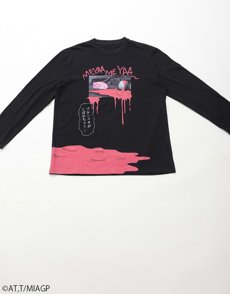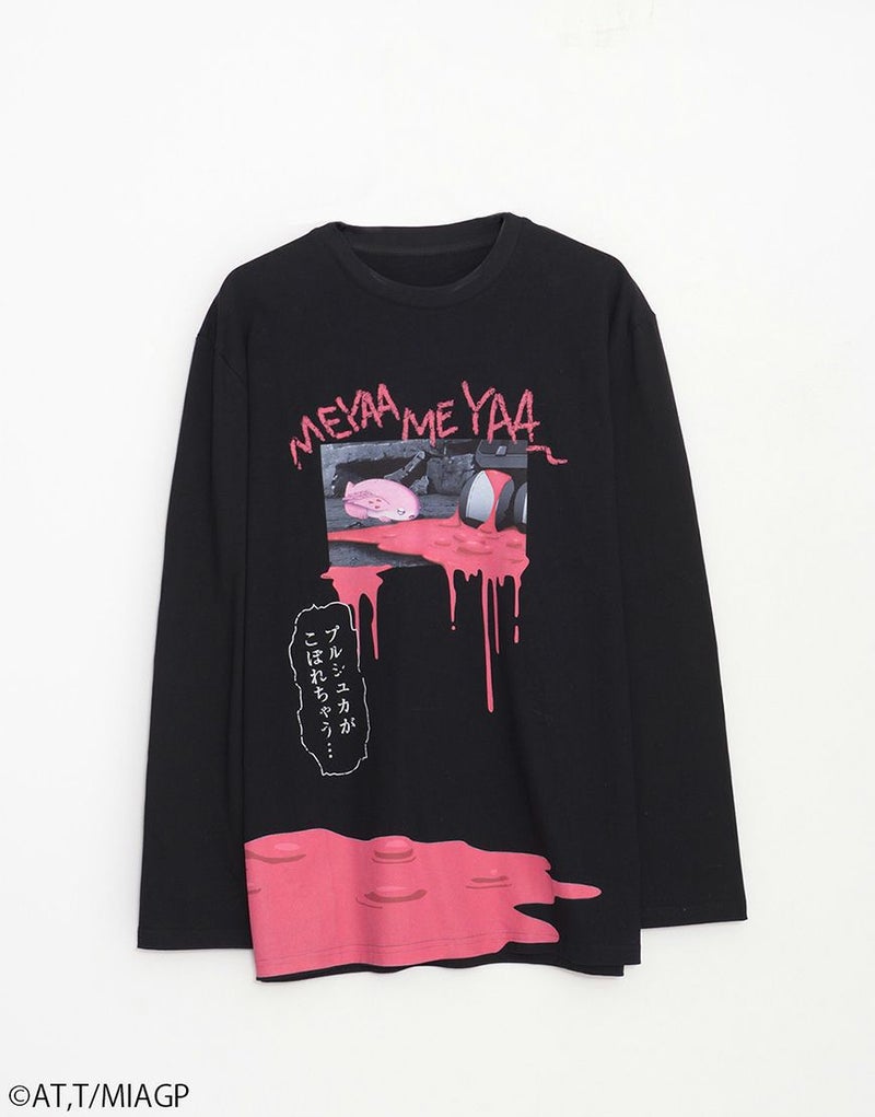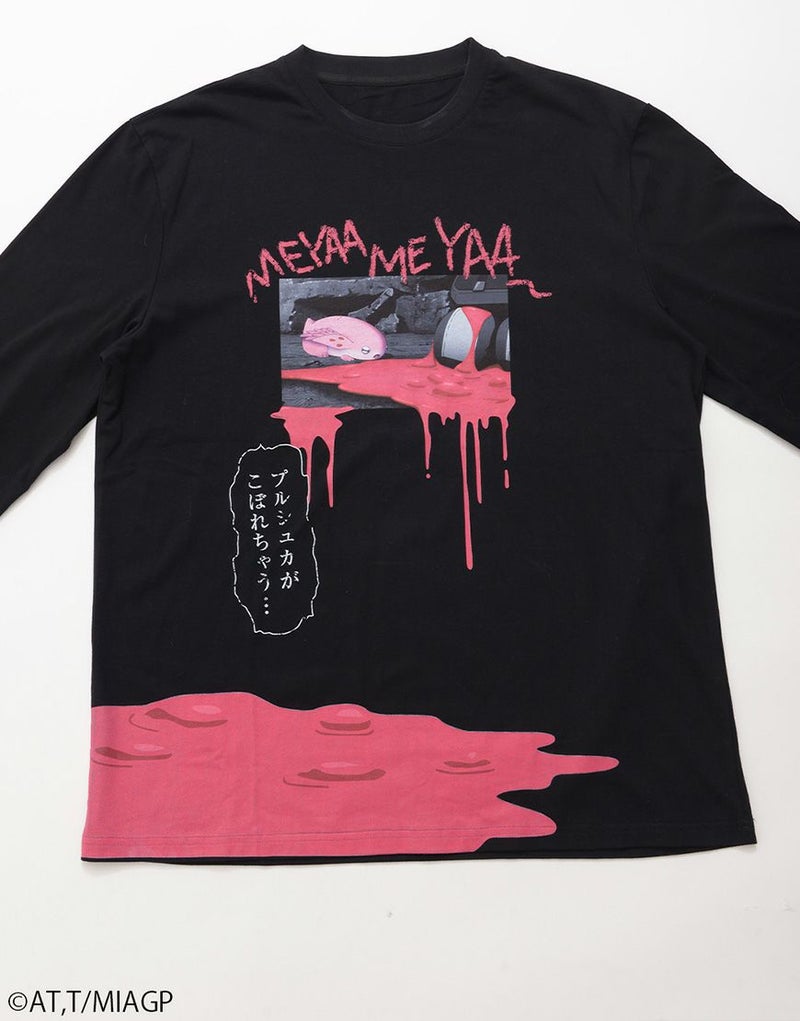 フロントには滴るピンクのプリントとともに、プルシュカとミーティのグラフィックを配置。