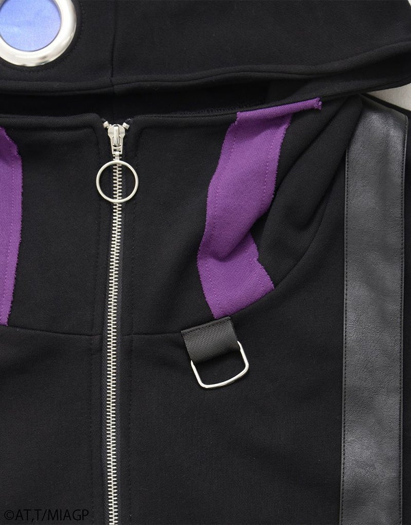 フード後部には角のような突起パーツとレンズモチーフを配置し、レグの機械的な要素をファッションへと昇華。