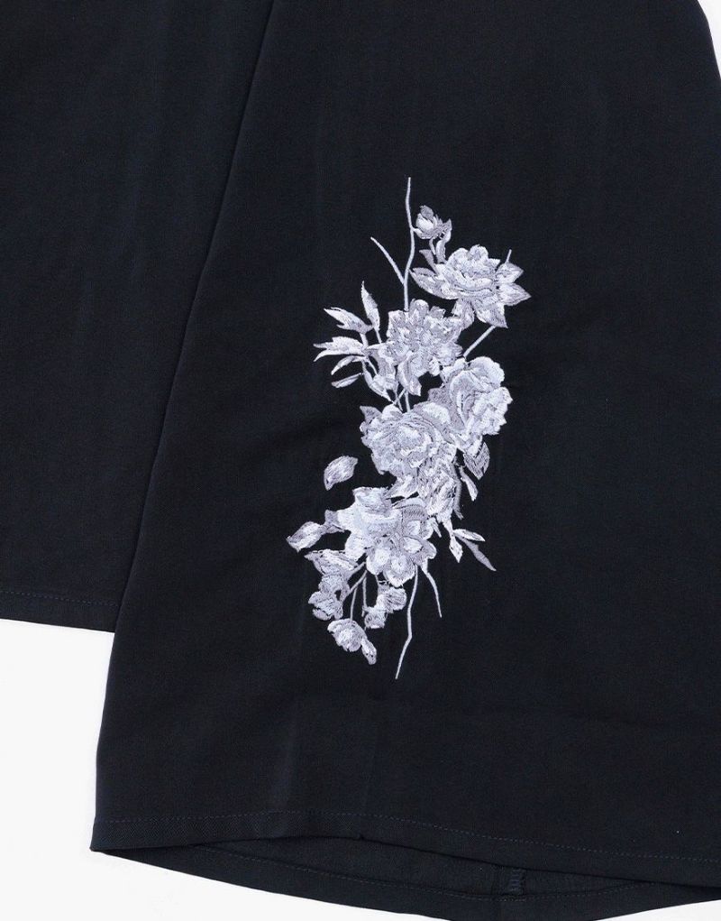 首元と袖には繊細なフラワーモチーフ刺繍を施し、さらに後ろ衿下にもロゴ刺繍を配置。