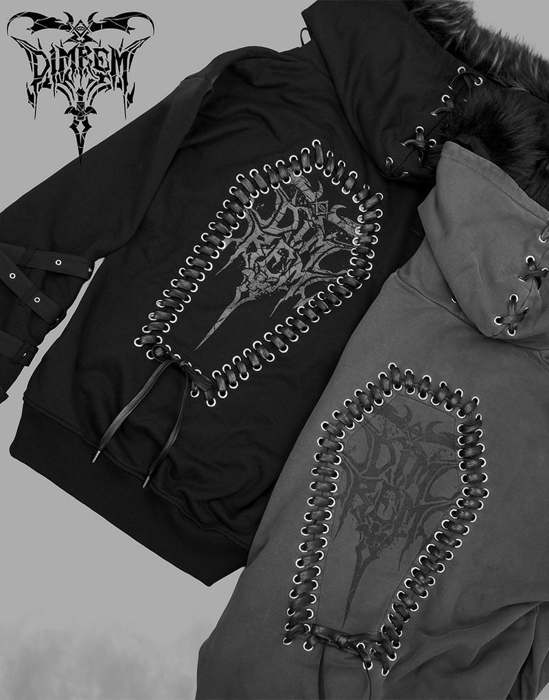 背中に大胆に配置されたDIMREMロゴ入り棺桶型のアップリケと、それを縁取るアイレット×シューレースの編み上げディテール.