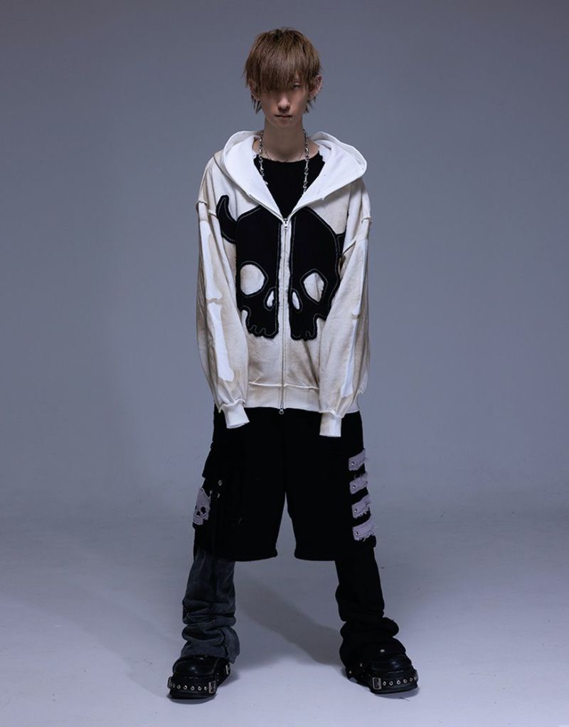 裏毛素材のジップパーカーにスカル部分にはガーゼ素材を使用。アートワークに質感の変化をつけたデザインスウェットパーカーです。