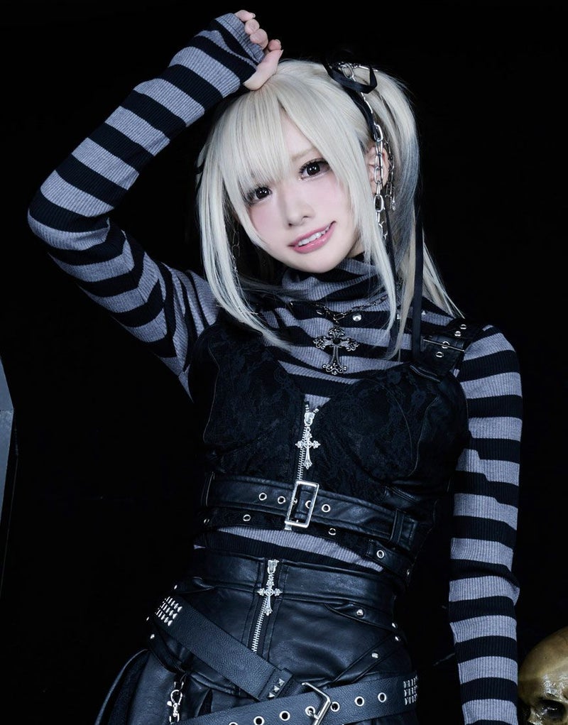 裾にはハトメを打ち込み、フェティッシュかつパンキッシュな印象に。
