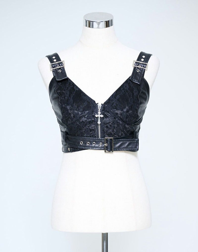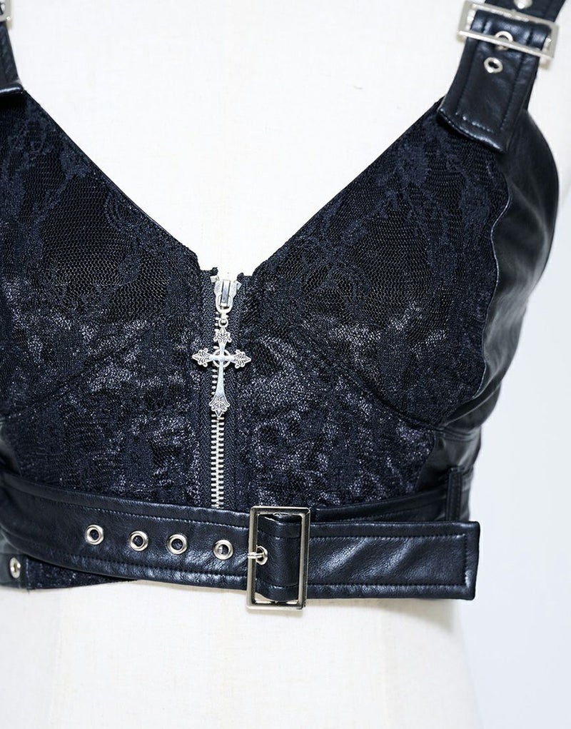 質感のあるシボ加工PUレザーをベースに、ベロアとレースを重ね合わせた妖艶なデザイン。