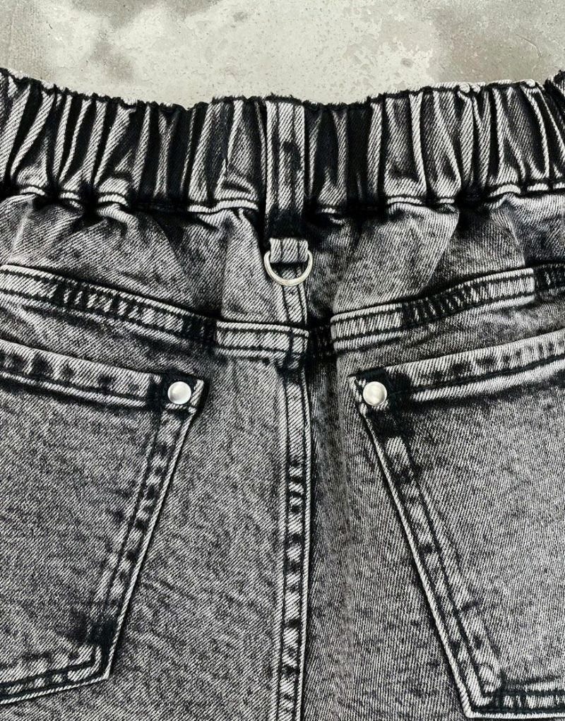 裾は大胆にくり抜いたようなダメージ加工が施され、サイドには存在感のあるサスペンダー仕様のハトメベルトを配置。