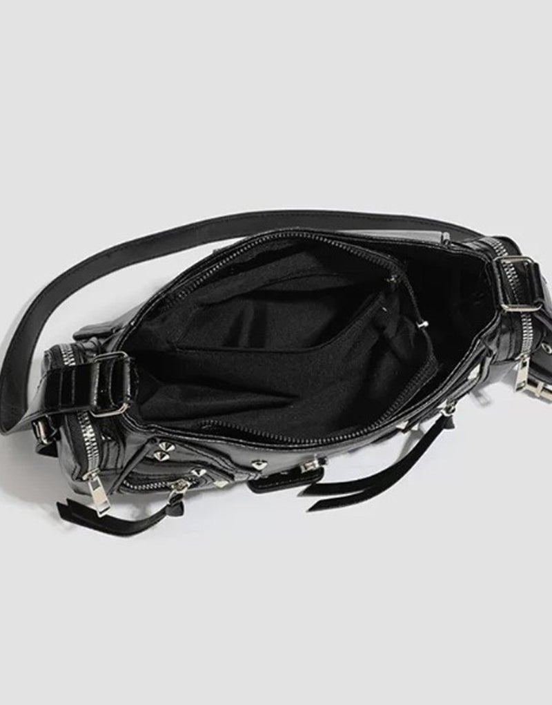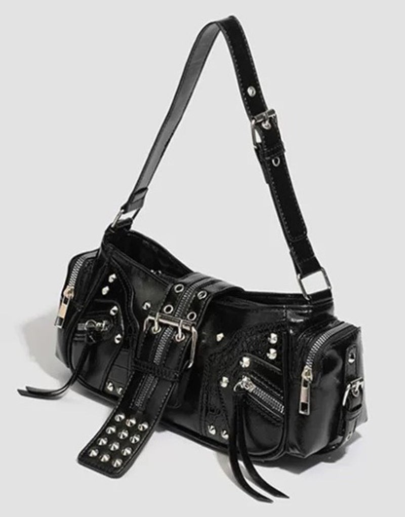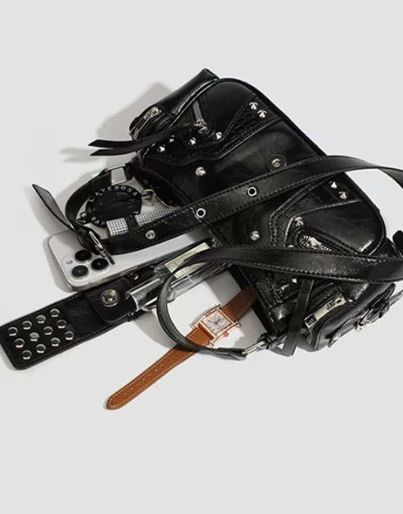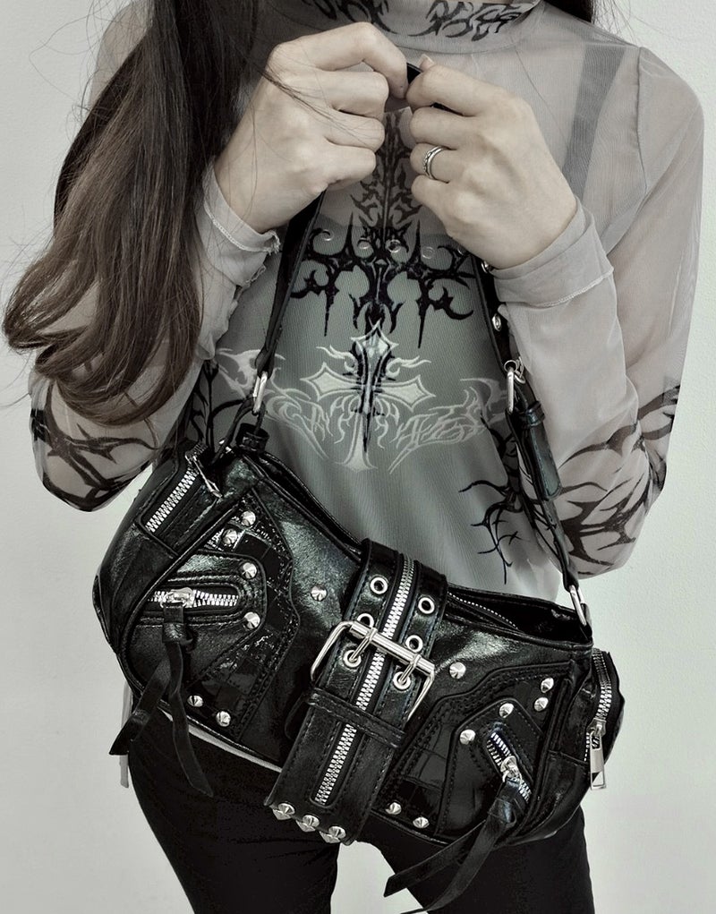NOVESSEL【ノベセル】2wayベルトスタッズデザインハンドバッグが登場。小ぶりなフォルムが可愛いハンドバッグ。各所に配置されたスタッズにギミックファスナー付きのベルト、型押しのクロコ柄など、装飾されたデザインがコーデの中に存在感を醸す闇かわ地雷バッグ。連結できるベルトがもう1本付くので2wayでショルダーバッグとしても使用できます。マチも広く取り、両サイドポケット付きなので使い勝手の良さも魅力となっています。 ※モデル画像は照明などの影響により実際の商品と異なる場合がございます。