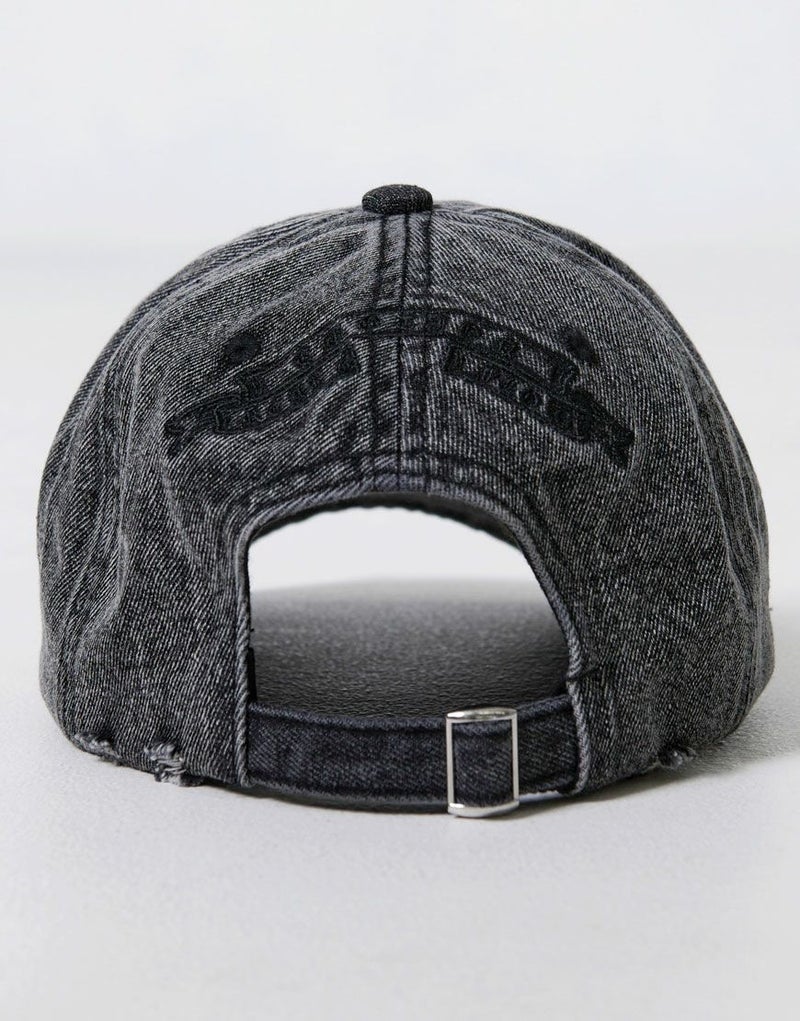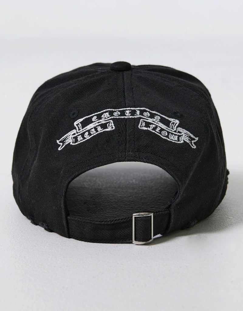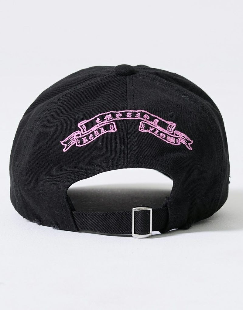 フロントにはブランドらしいクロスモチーフを立体感のある刺繍で施し、ツバ部分にはロゴ刺繍とダメージ加工をプラス。