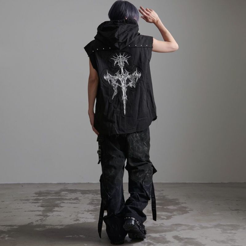 大胆に施されたスタッズデザインと背面のクロス・モチーフの貼り付けデザインが目を惹くアイテムです。