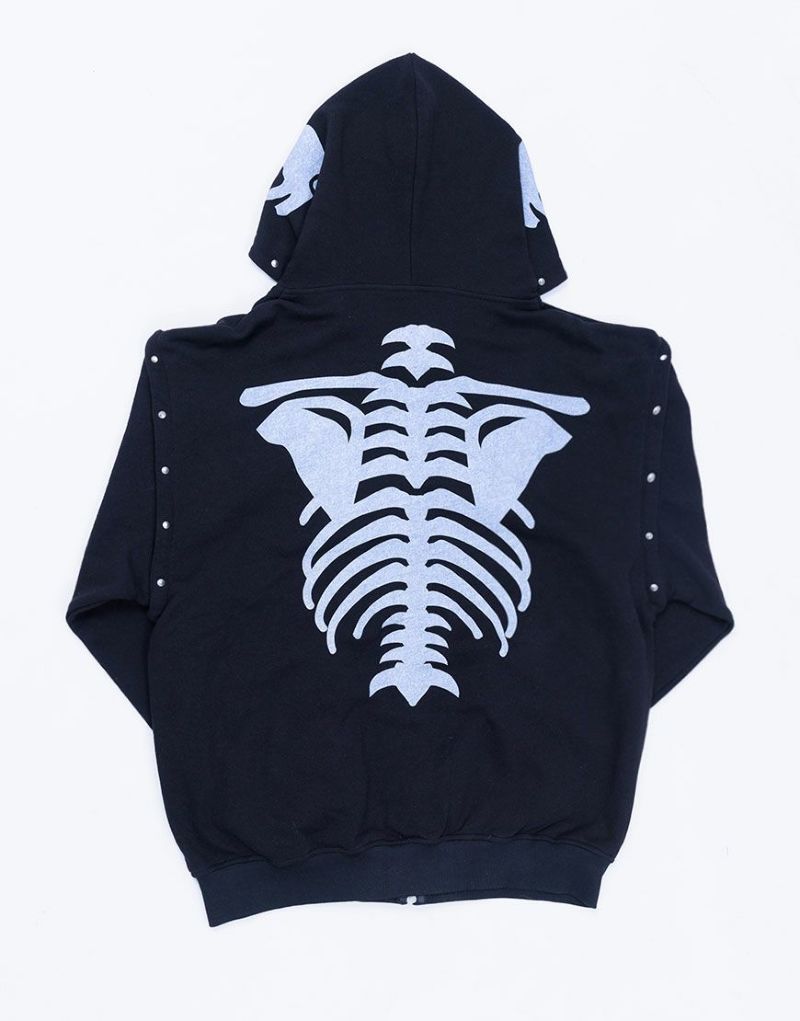 骨モチーフを大胆にプリントした、インパクト抜群のギミックパーカーが登場。