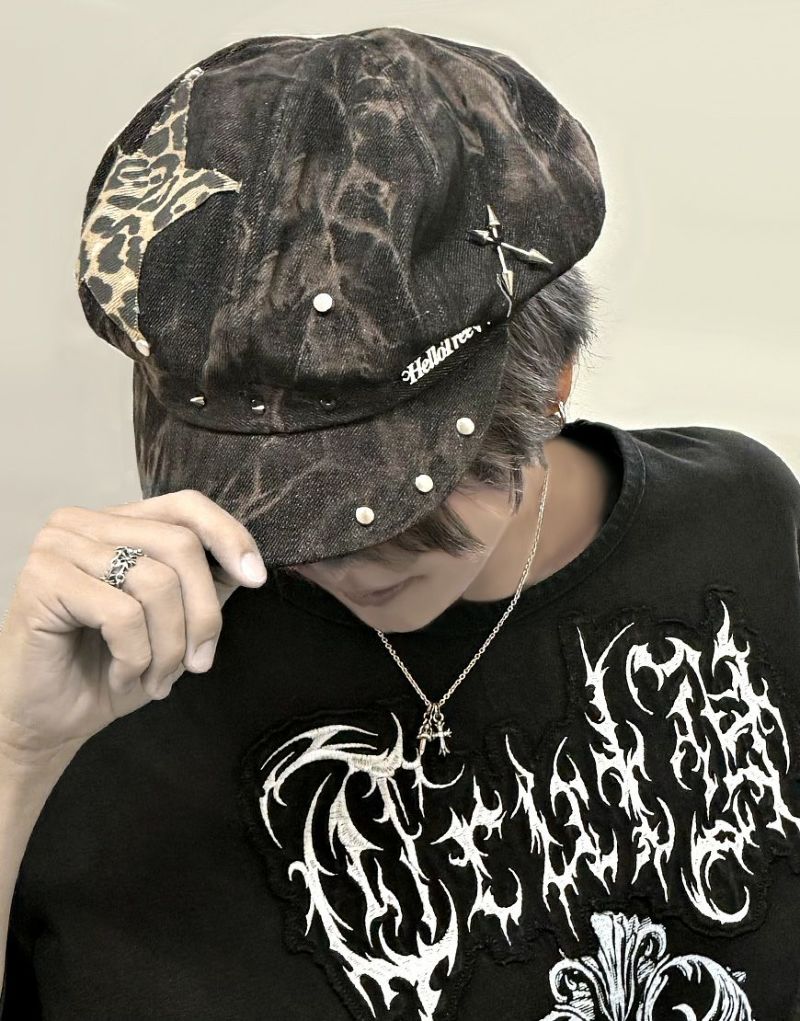 レオパード柄のスターパッチワークデザインが目をひくデニムキャスケット。