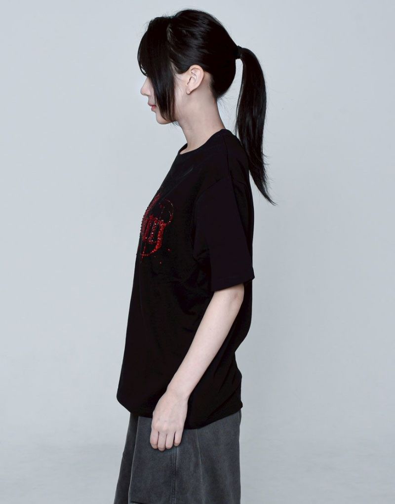 大小さまざまなラインストーンと使用してロゴをデザインの半袖トップスです。