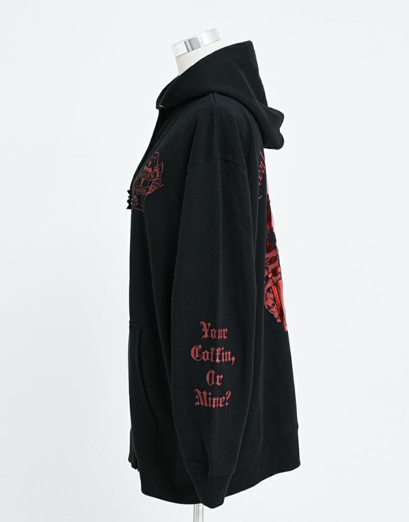 バックにスカルハンドとオーロラ箔を使用して描いた棺をプリントしたインパクト大のグラフィックが魅力のジップパーカー。