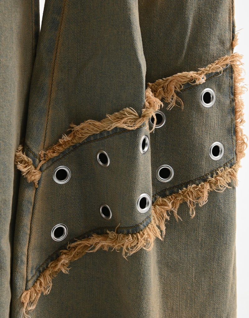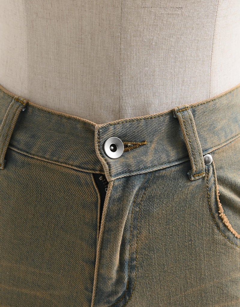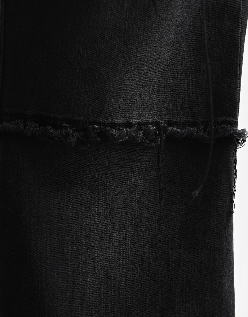大胆な切り替えラインはあえてほつれを残し、ラフで退廃的なムードを演出。穿き込んだような加工感と相まって、唯一無二の雰囲気を纏います。