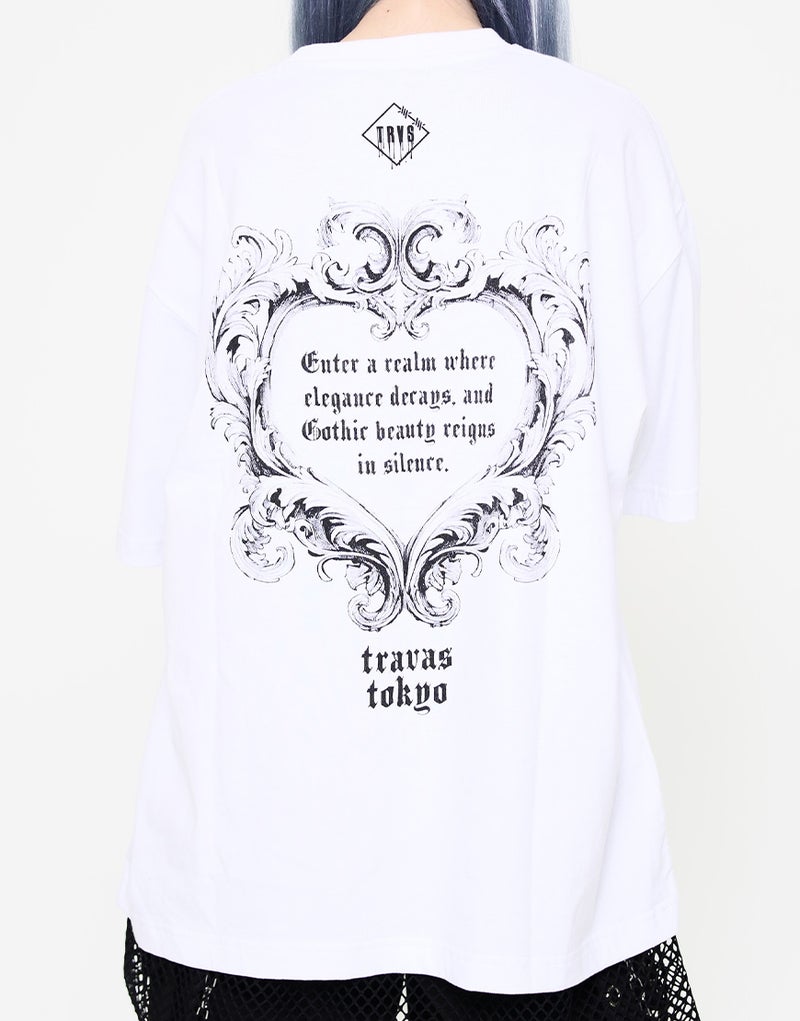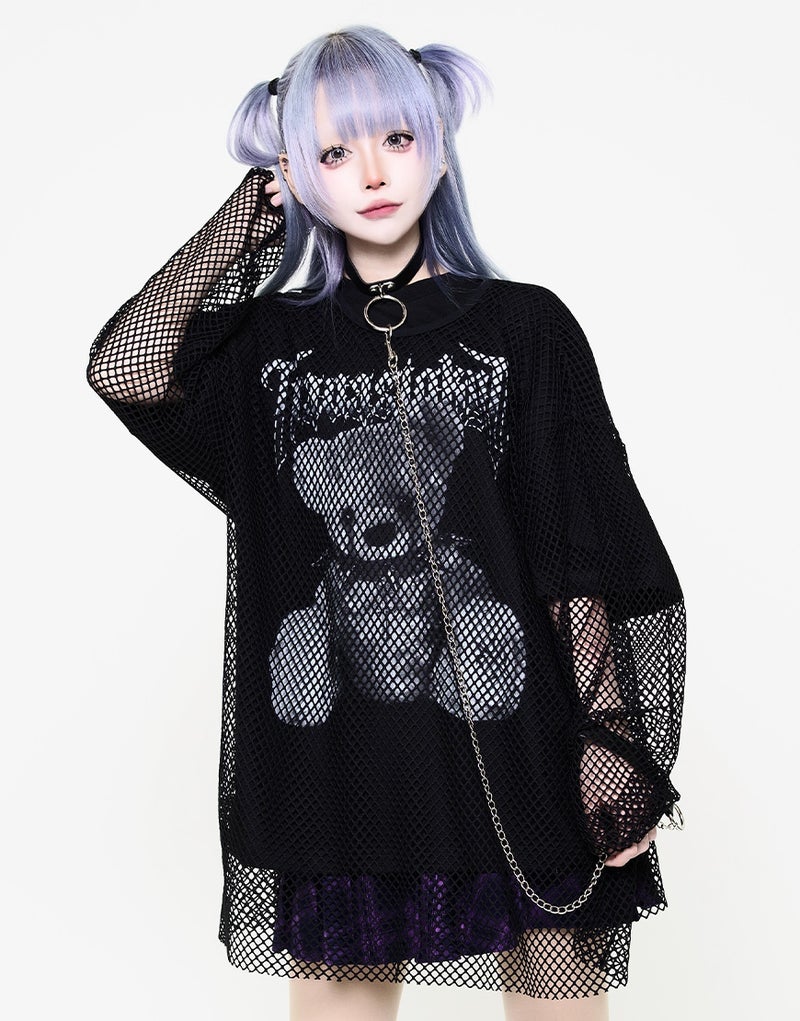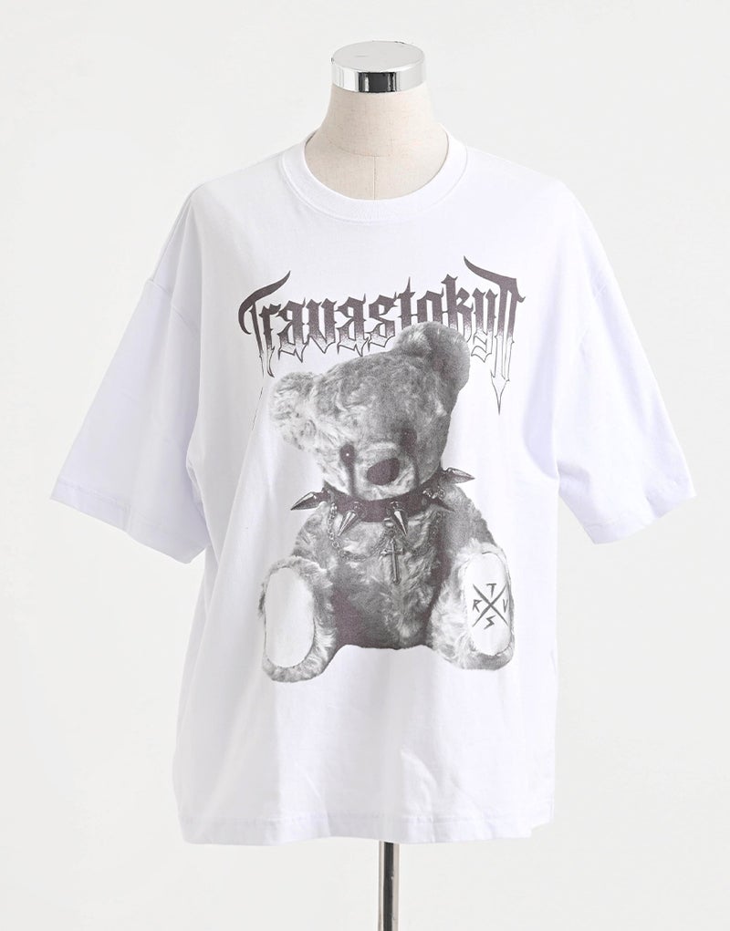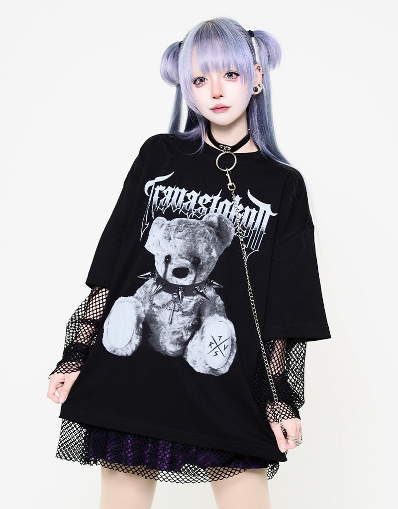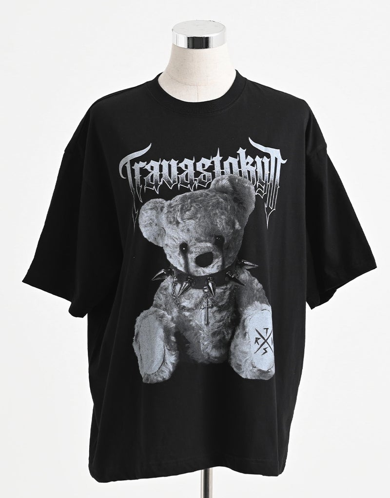 TEEにはブランドらしいダークで存在感のあるくまのアートワークをプリント。ゴシックなロゴと組み合わさることで、甘さと毒っぽさが共存した印象的なデザインに仕上がっています。