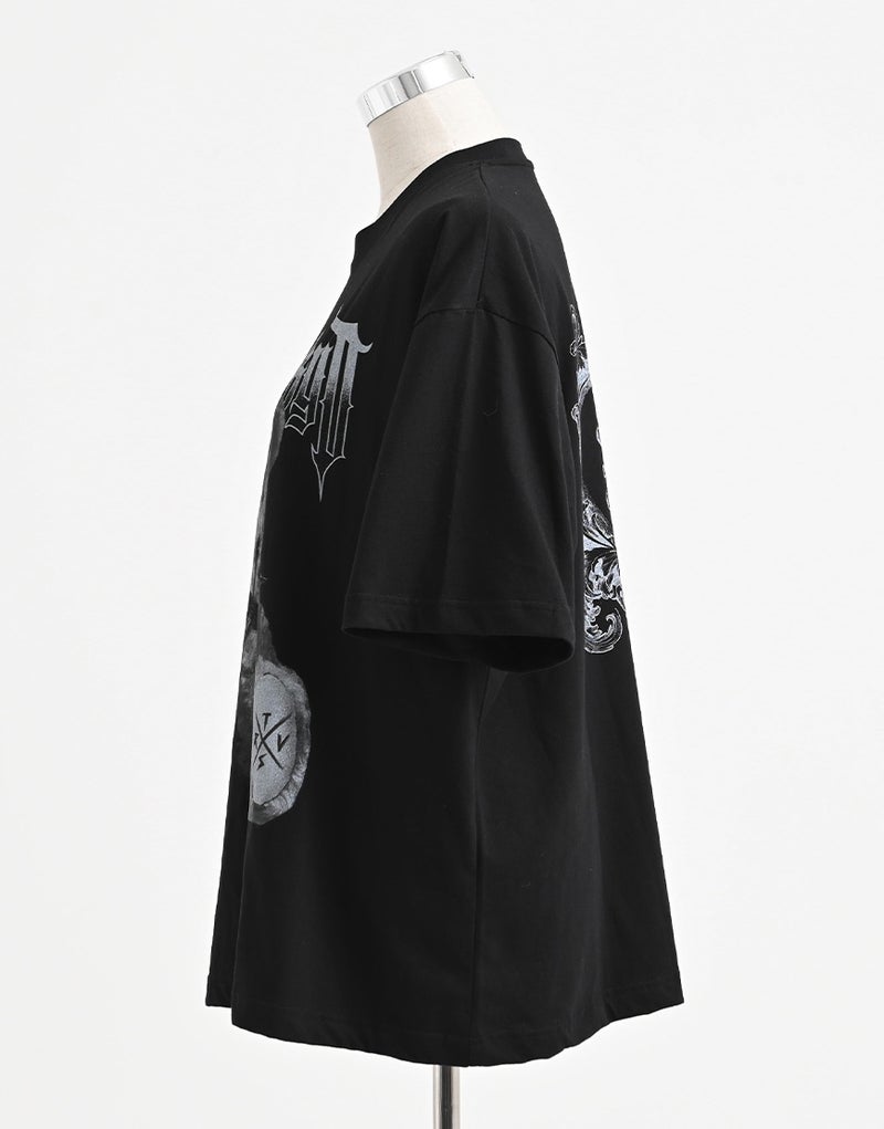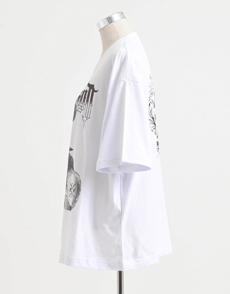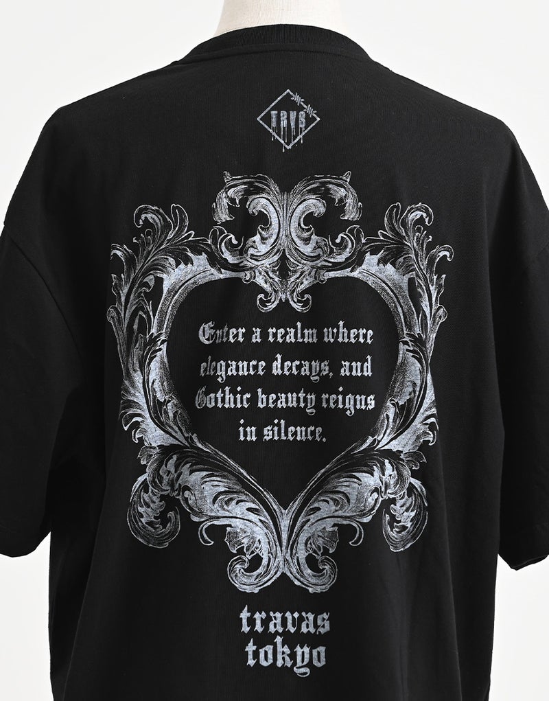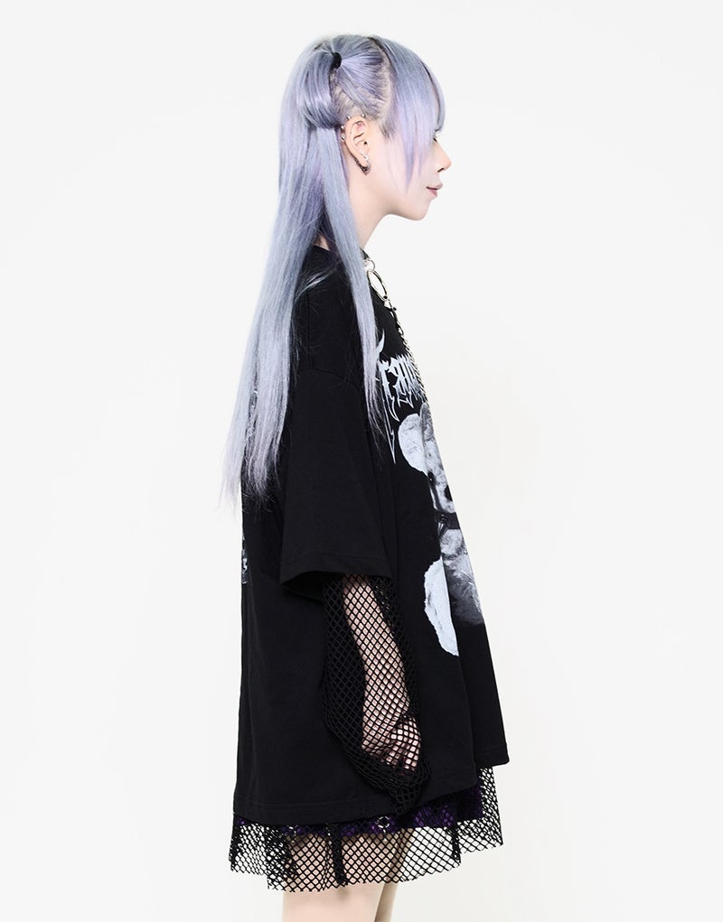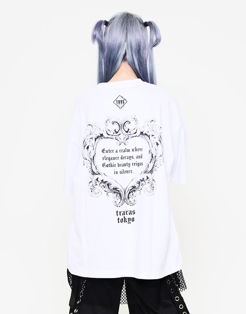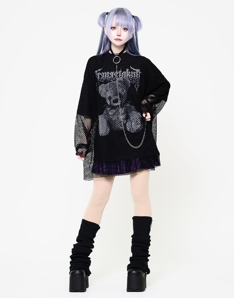 TEEにはブランドらしいダークで存在感のあるくまのアートワークをプリント。ゴシックなロゴと組み合わさることで、甘さと毒っぽさが共存した印象的なデザインに仕上がっています。