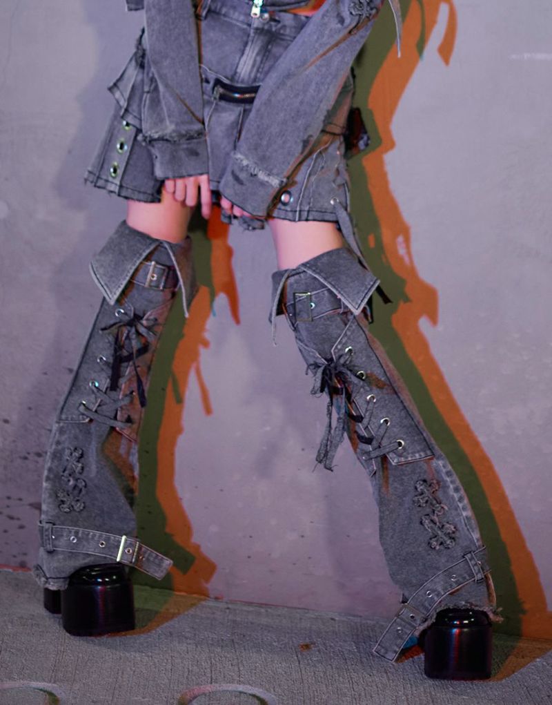 フロントの大胆なレースアップが目を引くニーハイ仕様のデニムレッグカバーの登場!!