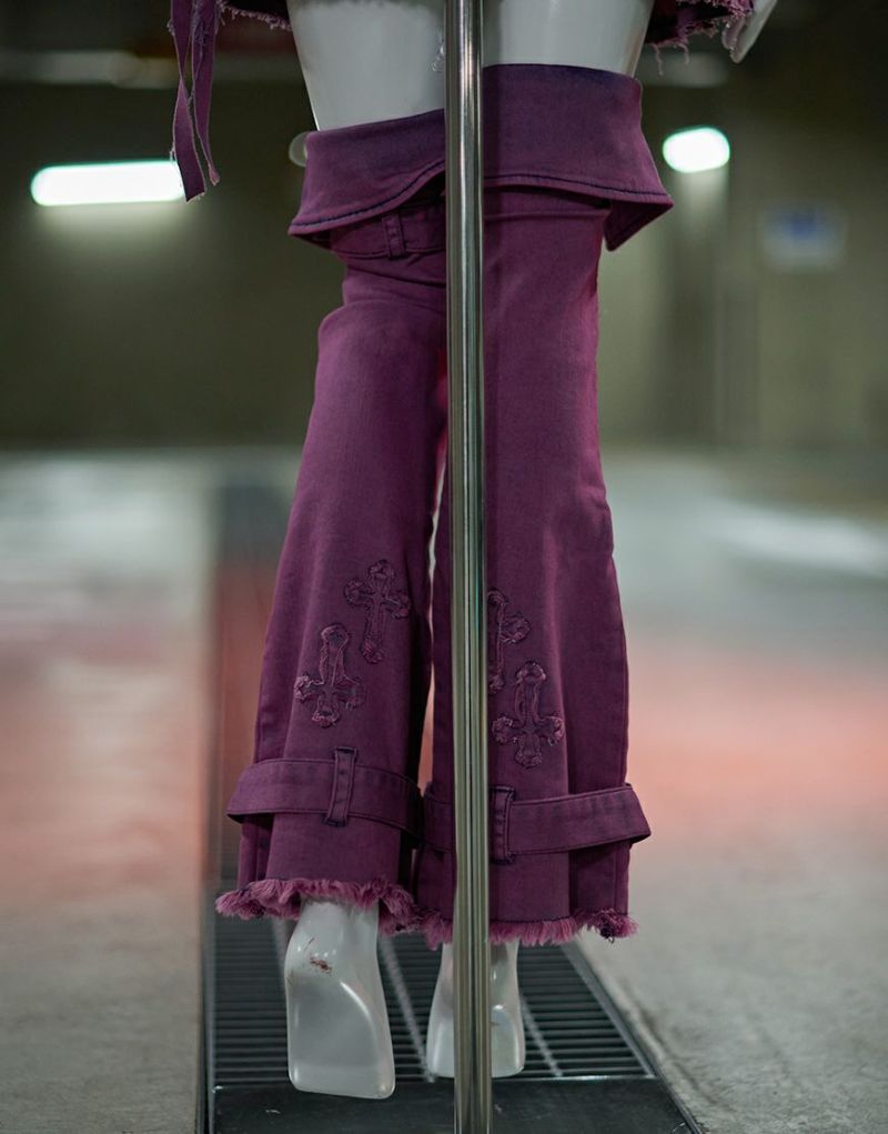 Gray色はブラックデニム生地を洗い加工、Purple色はIndigoデニム生地をパープル系に染め加工を施しました。
