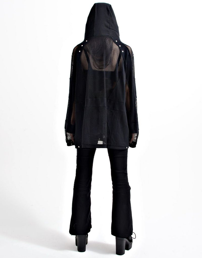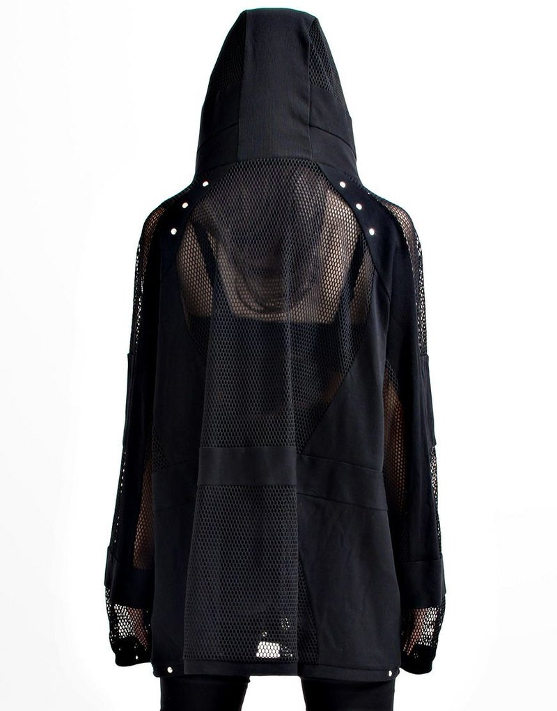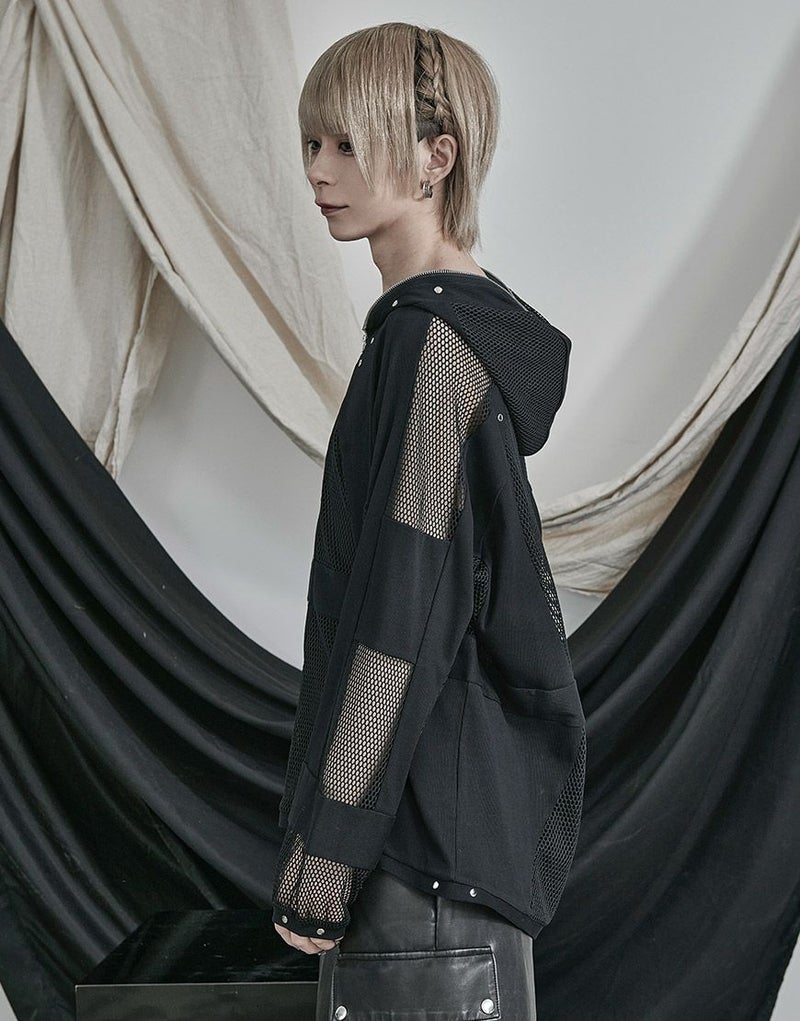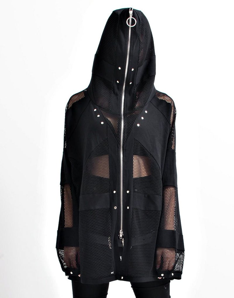 全体的に透け感のあるメッシュ生地とリブ生地の切り替えデザインをいれたパーカー。