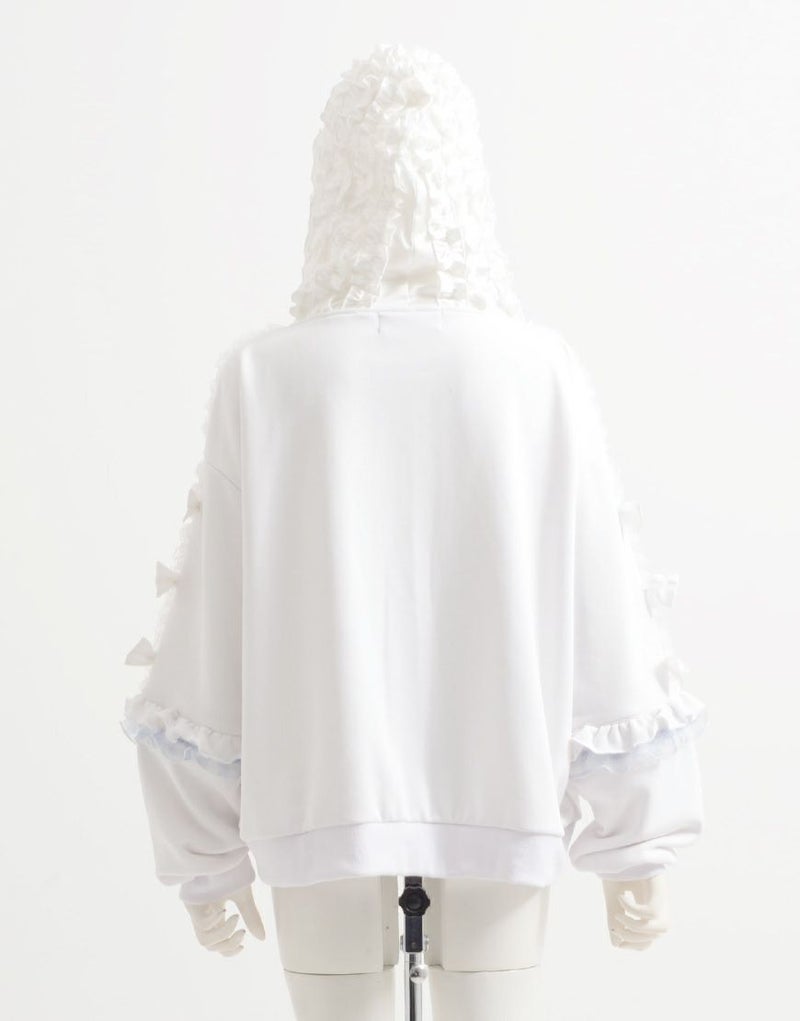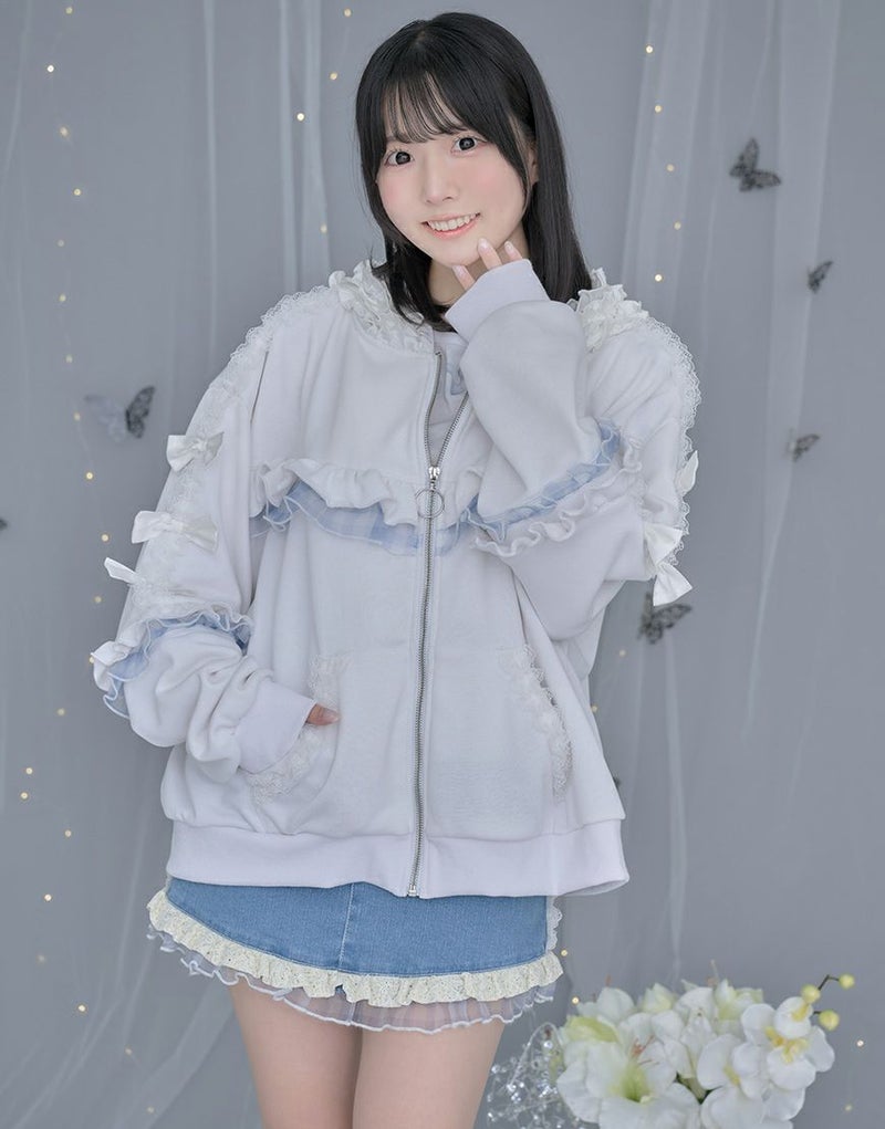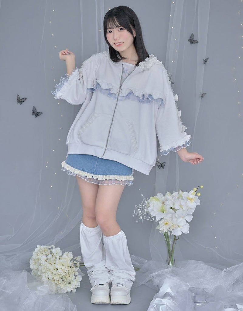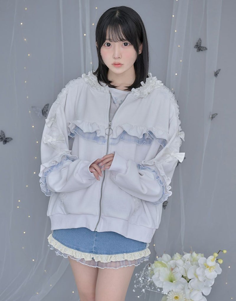 ililil【イルイルイル】より生クリームフリルのバブみ全開2wayパーカーが登場です。 まるで生クリームみたいなふわふわフードが主役 共地フリルと淡いチェックシフォンが、さりげない甘さを添えてくれるジップパーカー。 お袖は取り外しOKで、気分や季節に合わせてアレンジ自在♪ 「天使界隈さん」や「ゆめかわさん」にぴったりな、やさしいホワイトの一枚です。