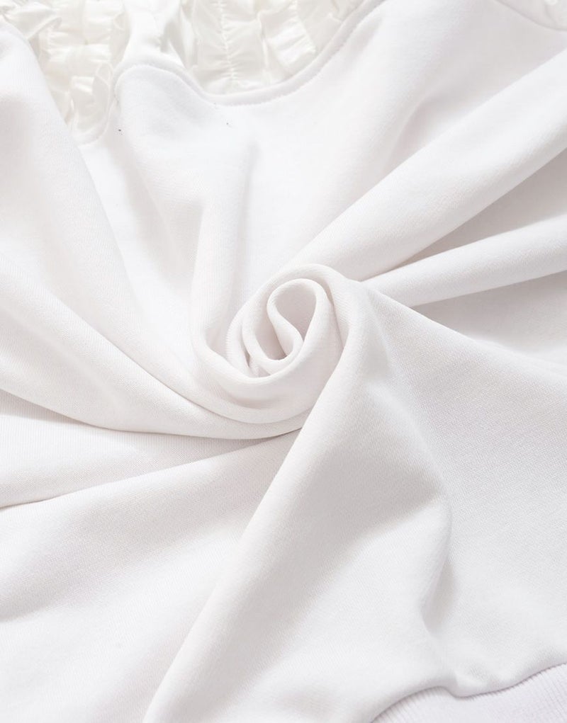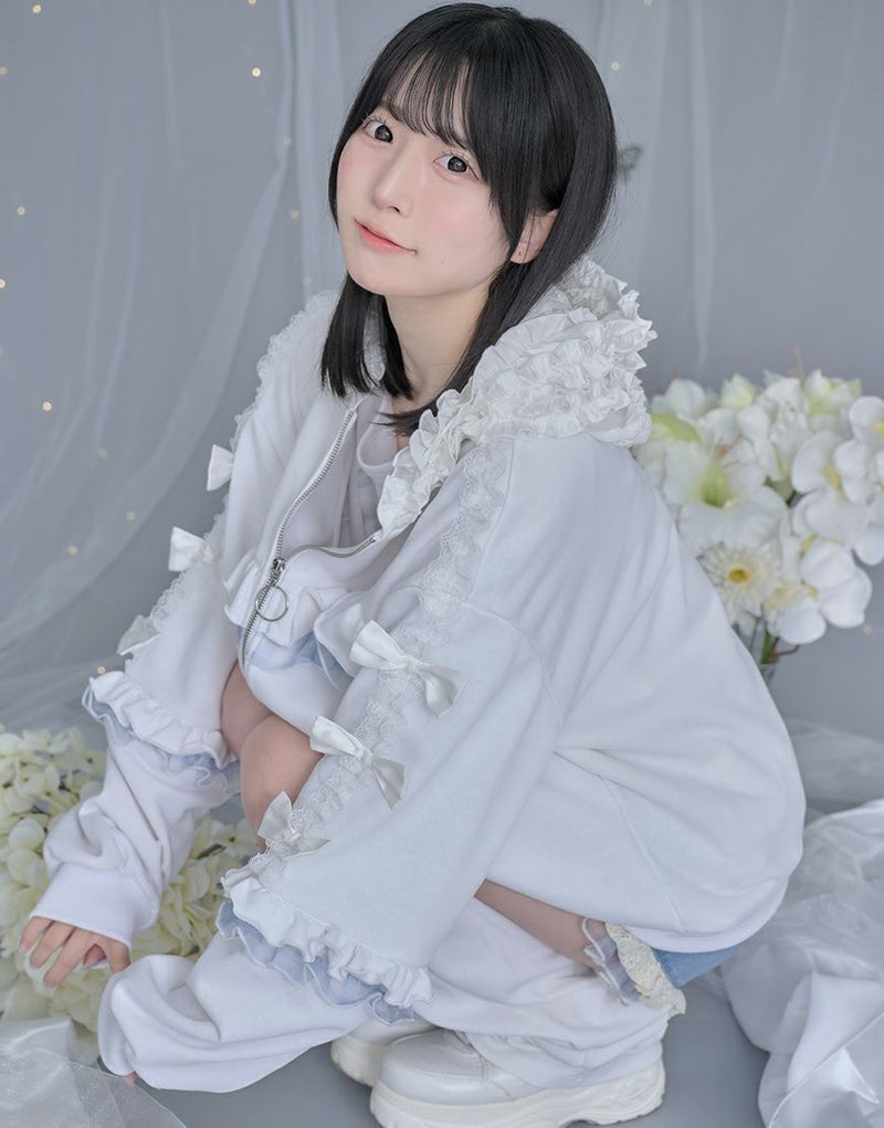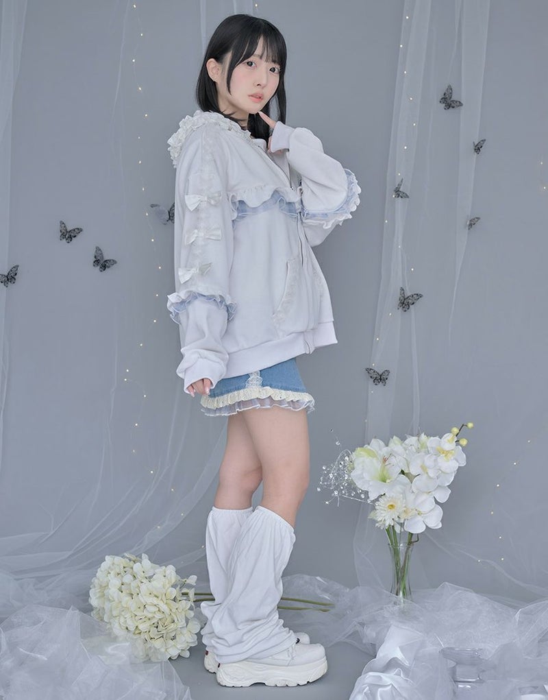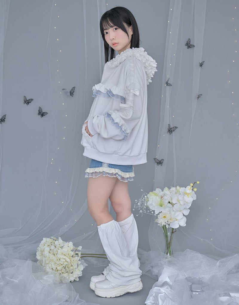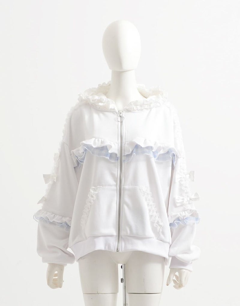 ililil【イルイルイル】より生クリームフリルのバブみ全開2wayパーカーが登場です。 まるで生クリームみたいなふわふわフードが主役 共地フリルと淡いチェックシフォンが、さりげない甘さを添えてくれるジップパーカー。 お袖は取り外しOKで、気分や季節に合わせてアレンジ自在♪ 「天使界隈さん」や「ゆめかわさん」にぴったりな、やさしいホワイトの一枚です。