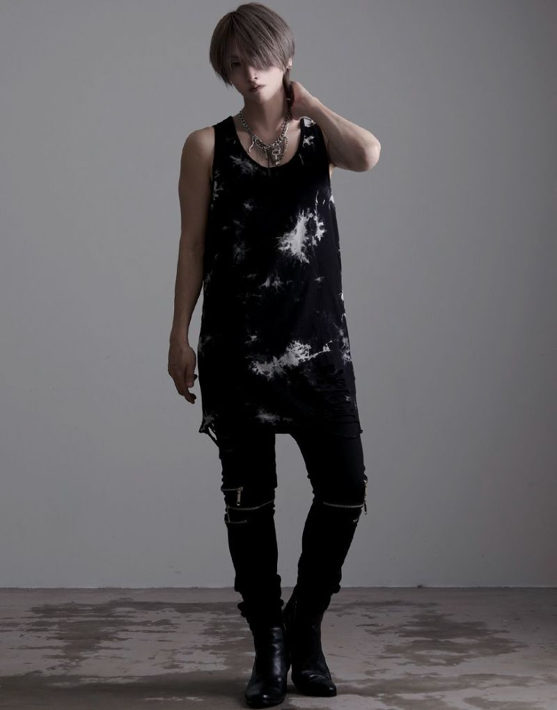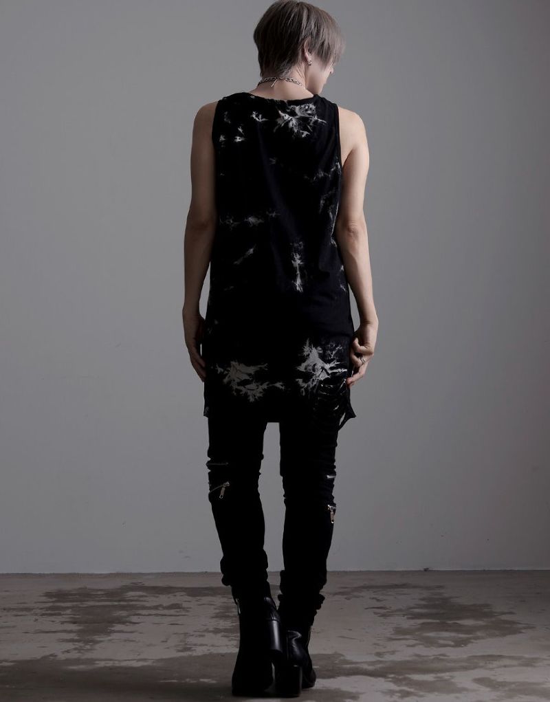 裾にかけて細かく激しいクラッシュ加工、ダメージ加工を配置し 一枚では勿論インナーとしてレイヤードにも使いやすく、アウターやシャツからダメージ部分を見せるようにグランジぽく着こなせるタンクトップです。