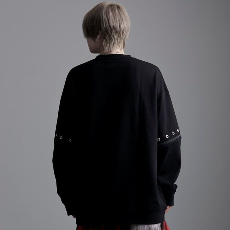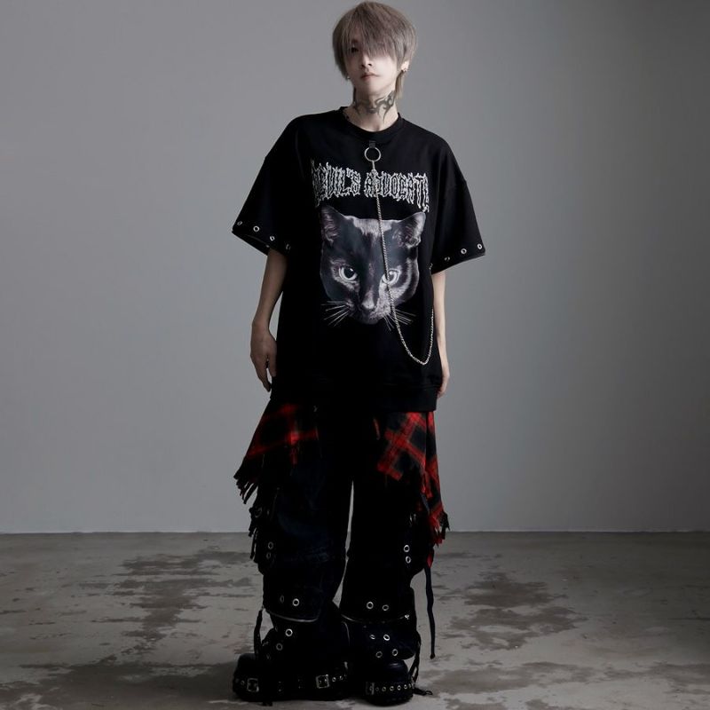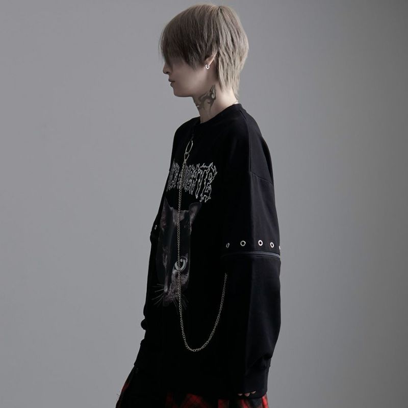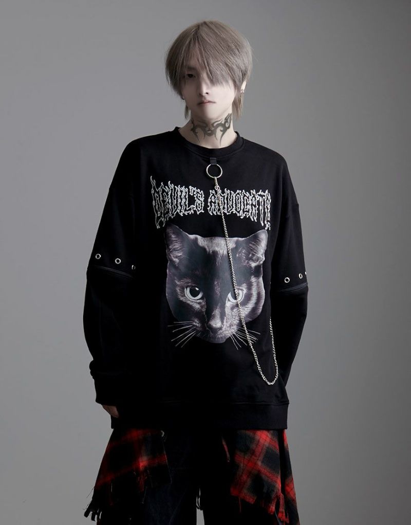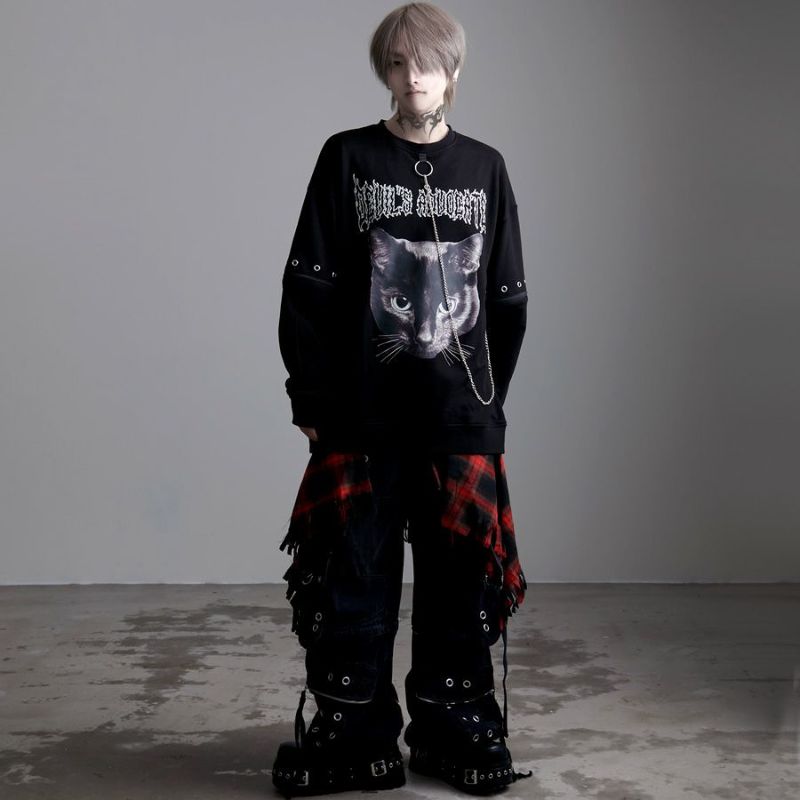 病みかわいい黒猫グラフィックをフロントに大きくプリントしたデザインスウェットトレーナー。