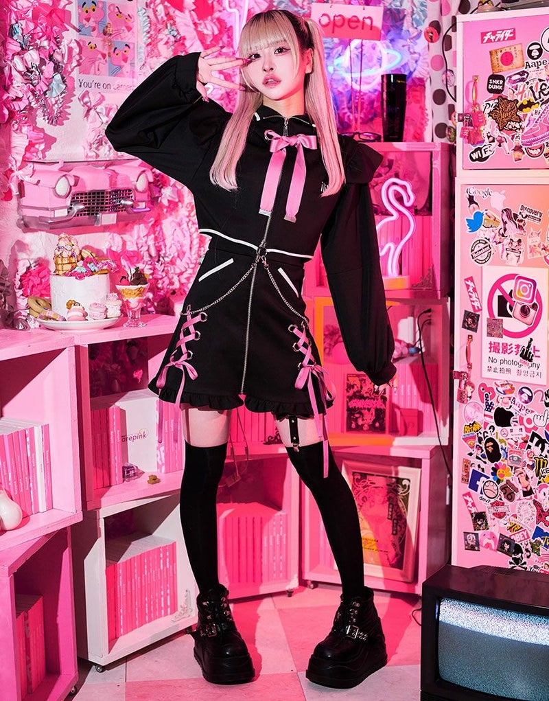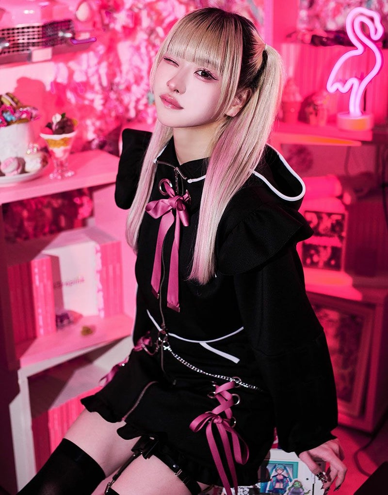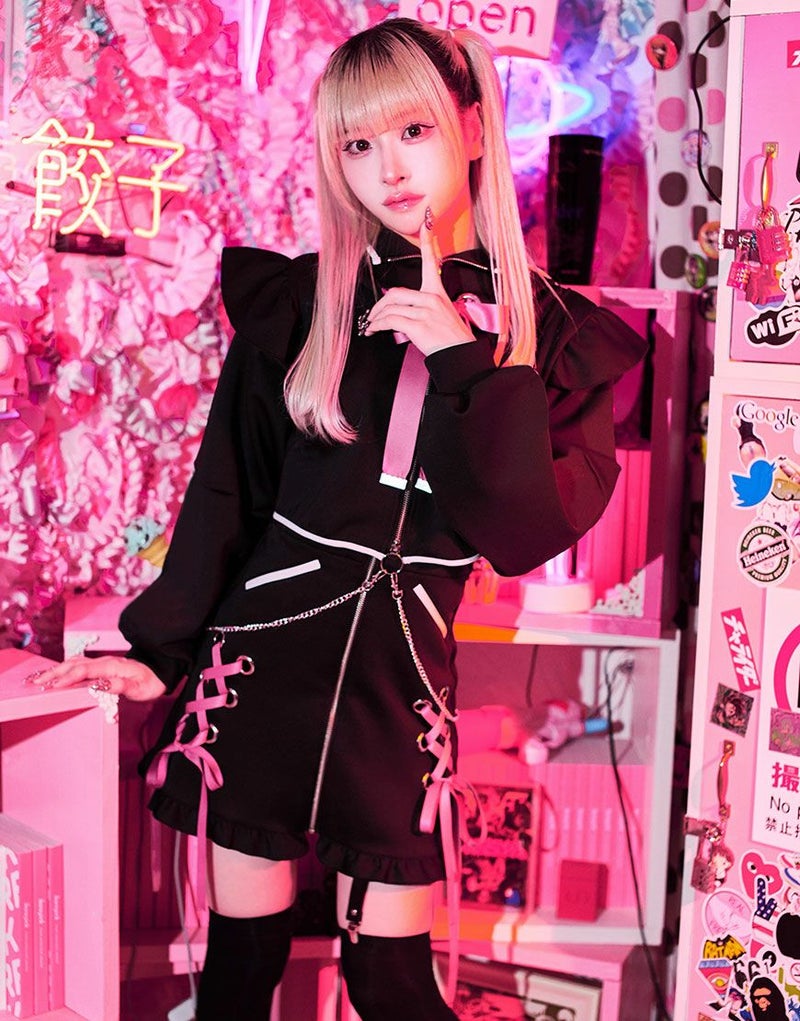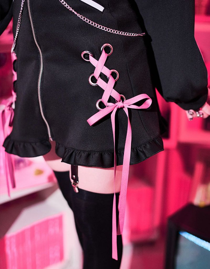 スカートにはフロント左右にレースアップデザインを施し地雷感を演出しました☆
