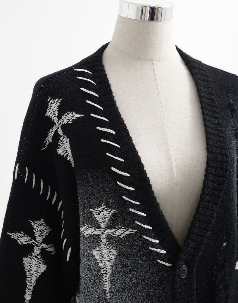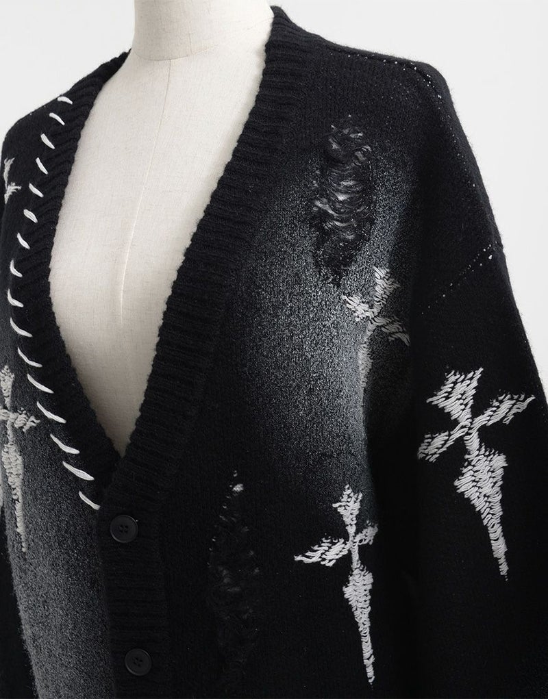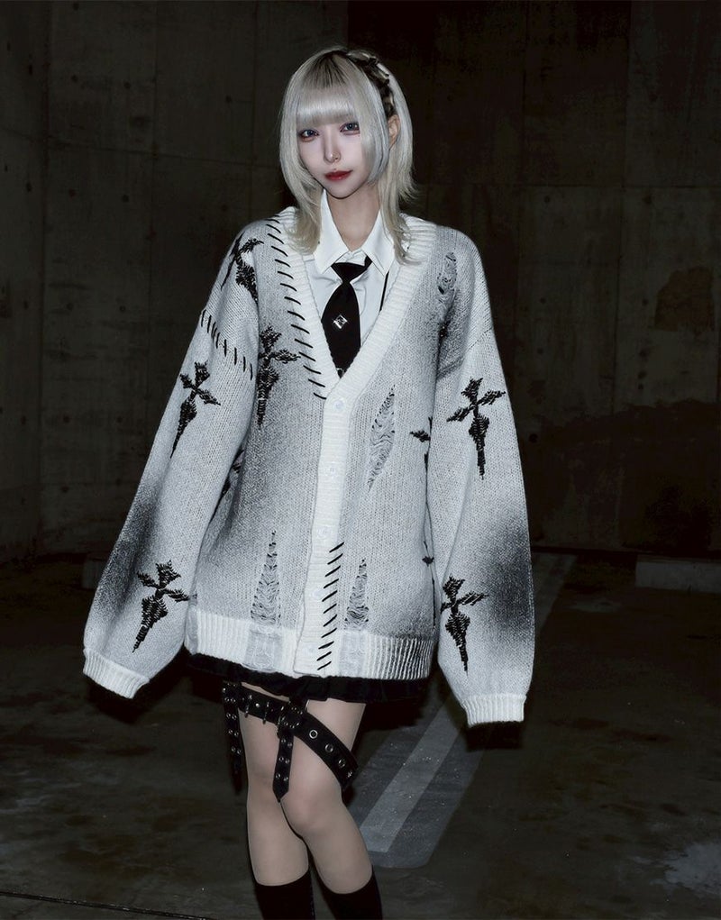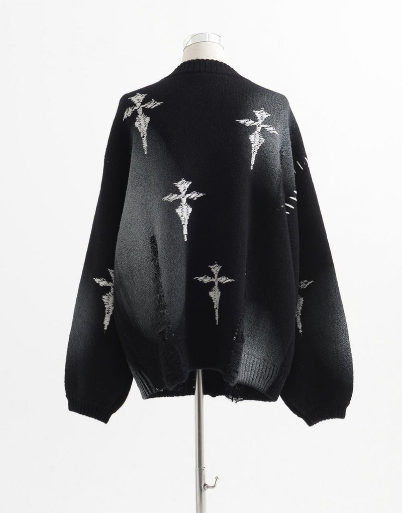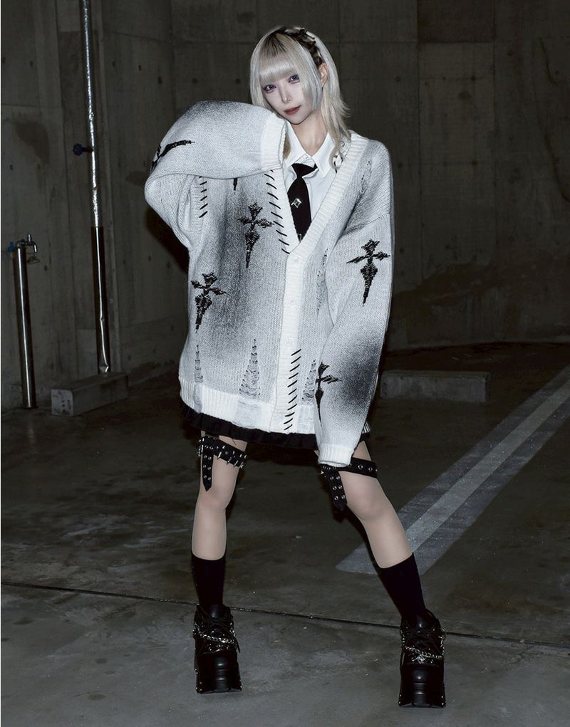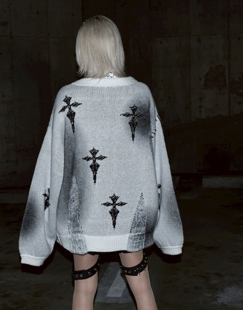 全体に散りばめられた十字架が印象的で、退廃的な雰囲気を漂わせるダメージ加工がポイント。
