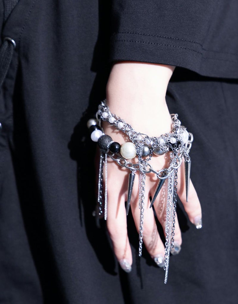 どんな世界でもあなたらしく生きられるような、 強さと美しさの"絶対的守護服" 【AdaNous】 Produced by てのひらえる イミテーションパール、スパイク、チェーンと無数のパーツが繋がり合い、唯一無二の存在感を放つ3連ブレスレット。 ユニセックスで使えるデザインは、ジェンダーを越えて手元にインパクトを与えます。 ブランドロゴが刻印されたプレートも配され、細部までこだわり抜かれた仕上がり。 専用のAdaNousロゴ入りボックスに入れてお届けするため、ギフトにもおすすめです。