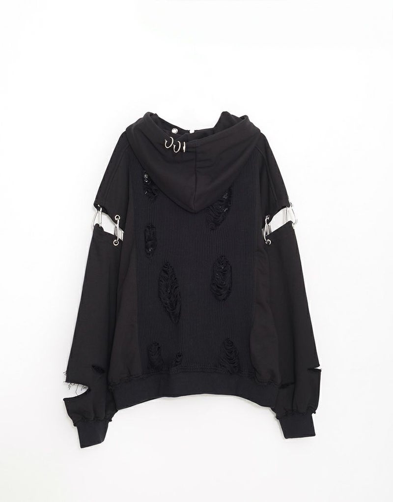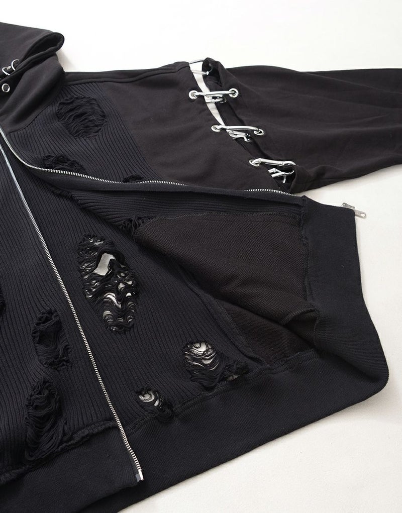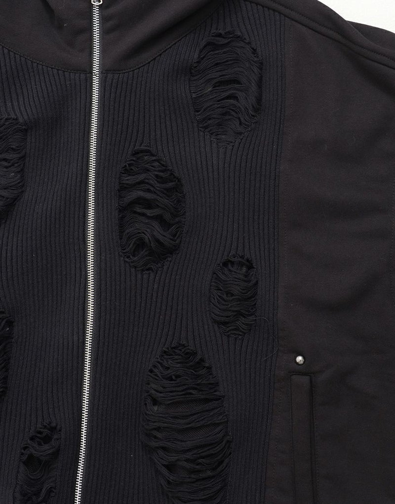 ラフなダメージ加工が施されたニット部分が、退廃的なムードを漂わせる一着です。