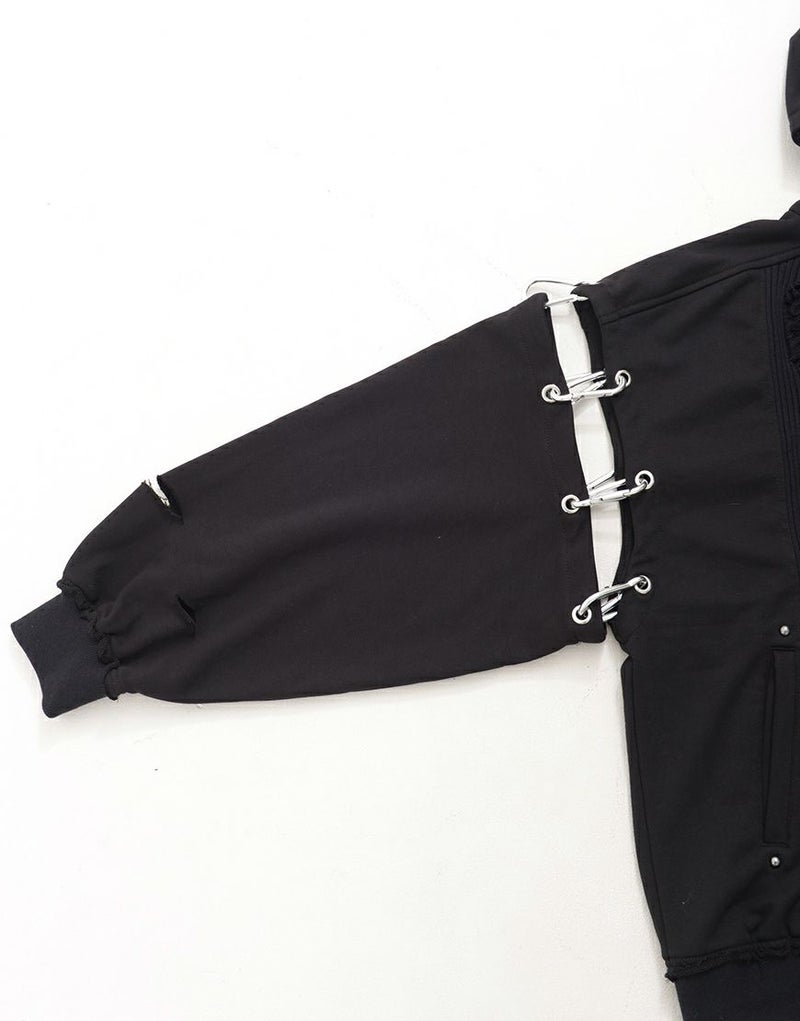肩から袖にかけては、複数のカラビナで接続された大胆な分離構造を採用。