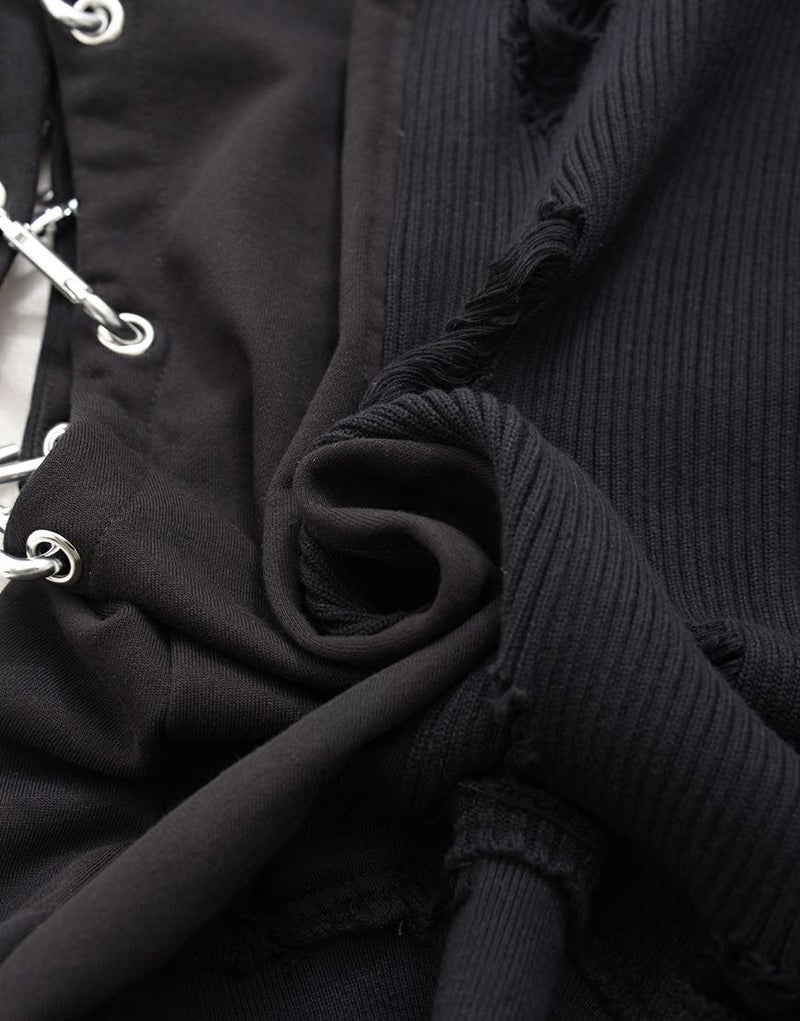 無機質なブラックボディに、ニットと裏毛の切り替えを施した構築的なデザイン。