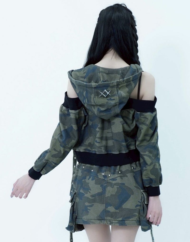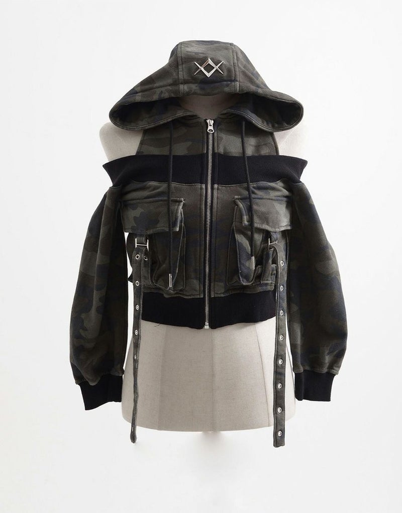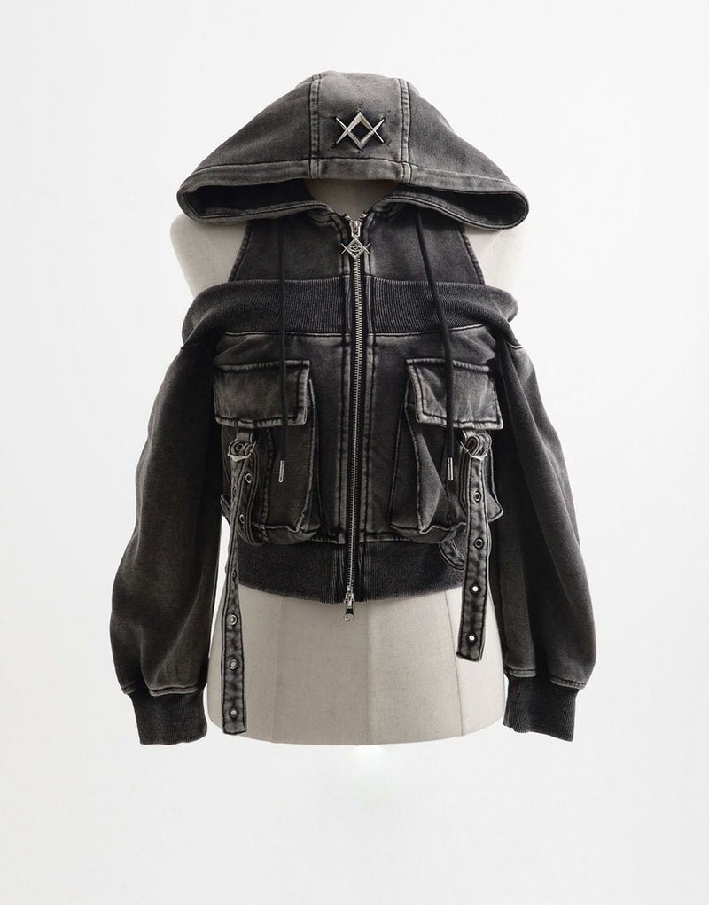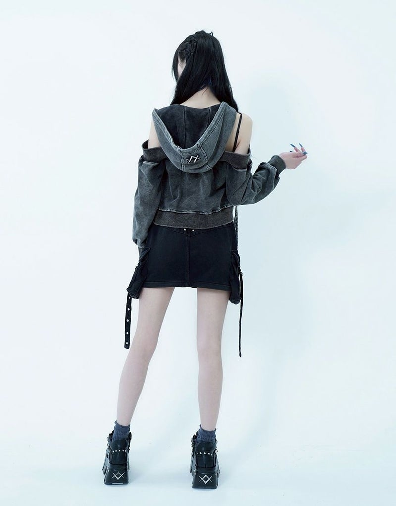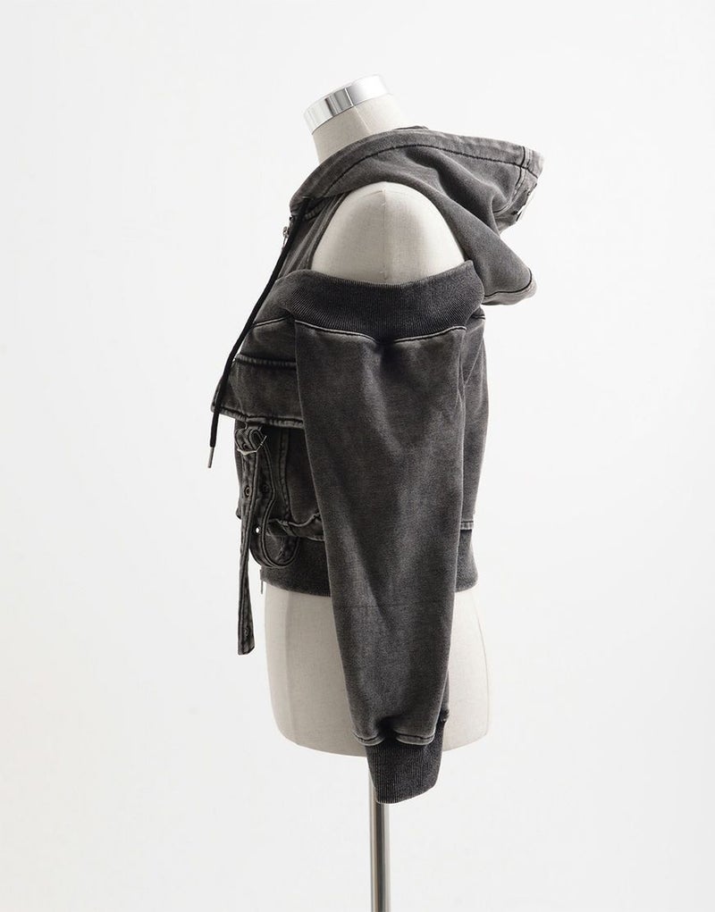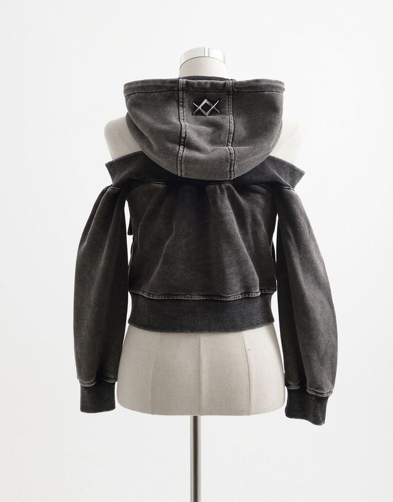 オフショル仕様で着用できるデザイン性の高いクロップド丈ジップパーカー。