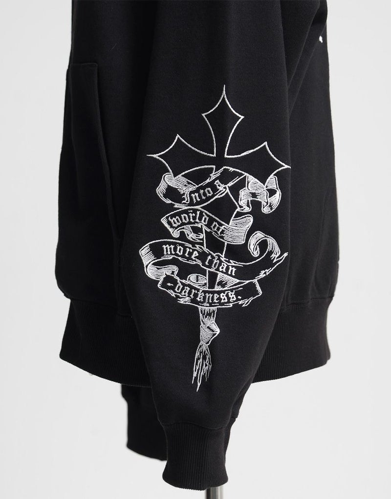 象徴的なクロスモチーフ刺繍を背面に大胆に配置し、フロントや袖にも連動した刺繍デザインを施すことで、360度どこから見ても印象に残る一着に仕上げました。