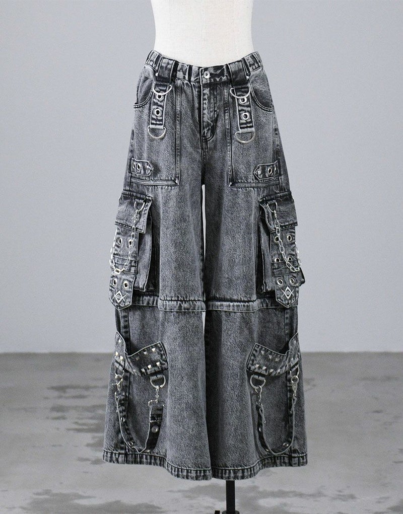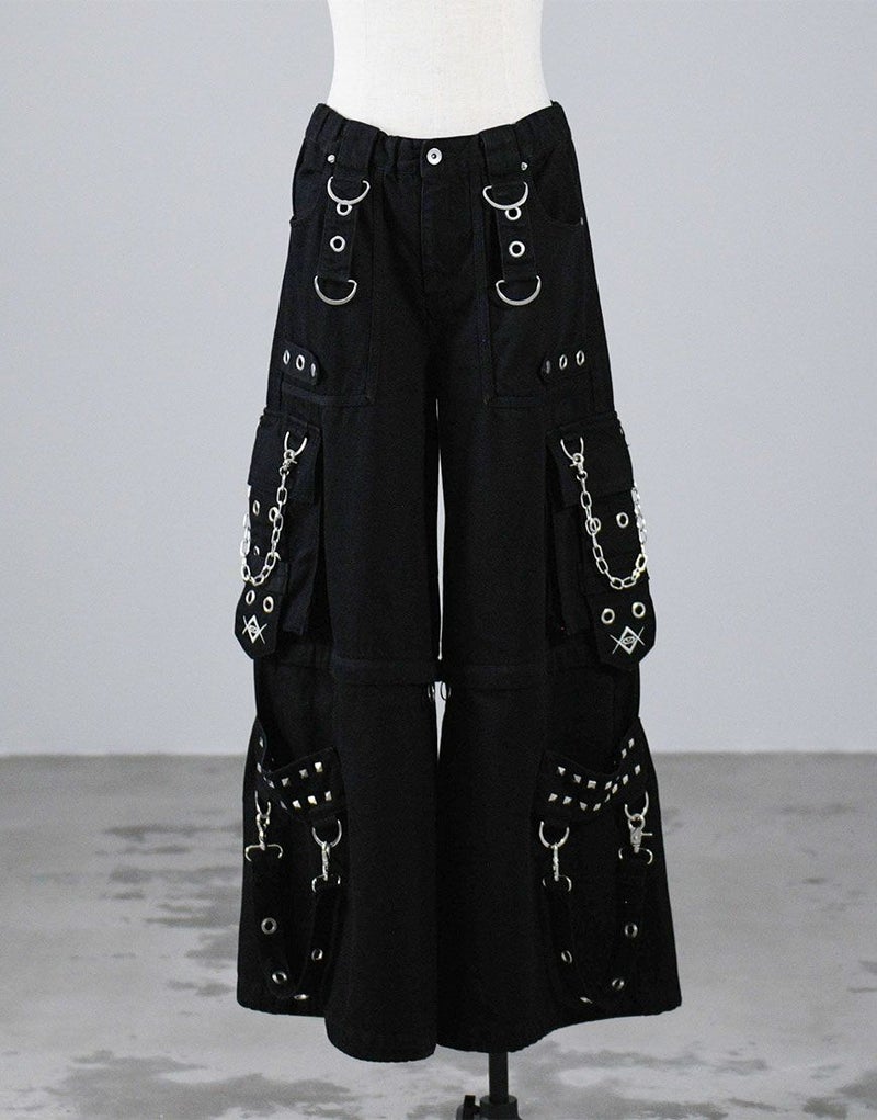 綿100%のブラックデニム素材を使用したボンテージワイドカーゴパンツです。