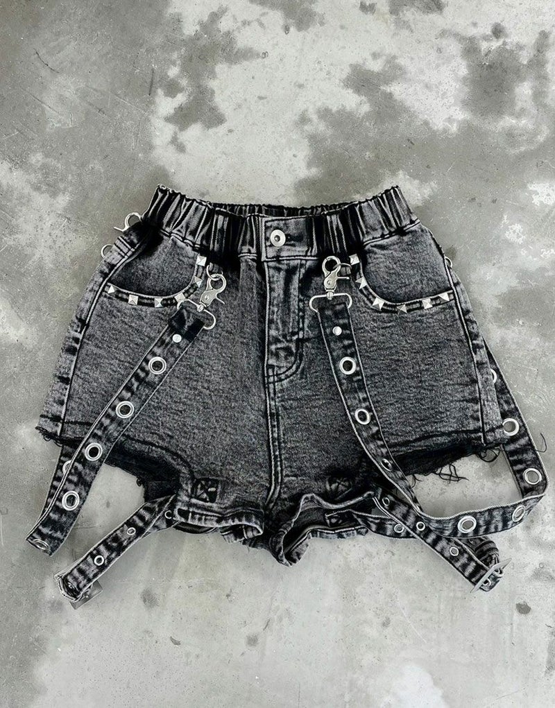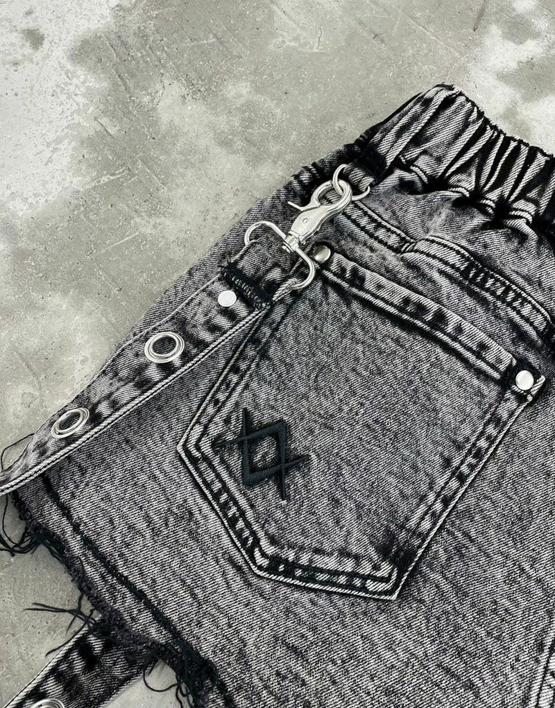裾は大胆にくり抜いたようなダメージ加工が施され、サイドには存在感のあるサスペンダー仕様のハトメベルトを配置。