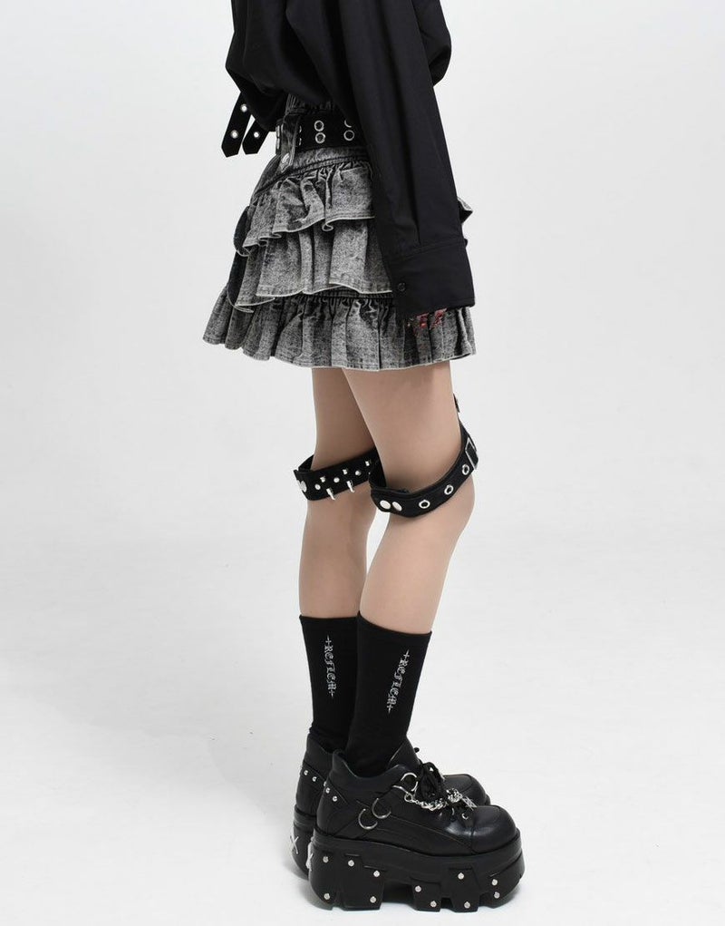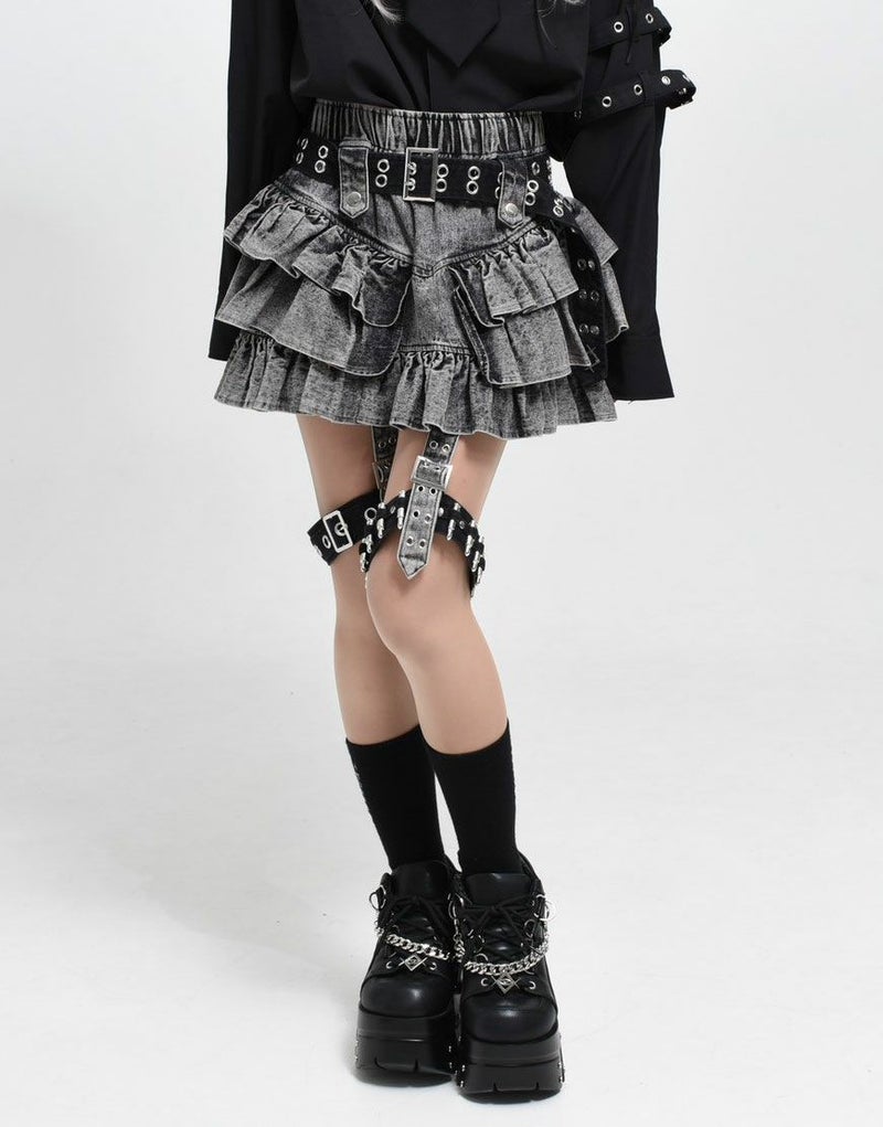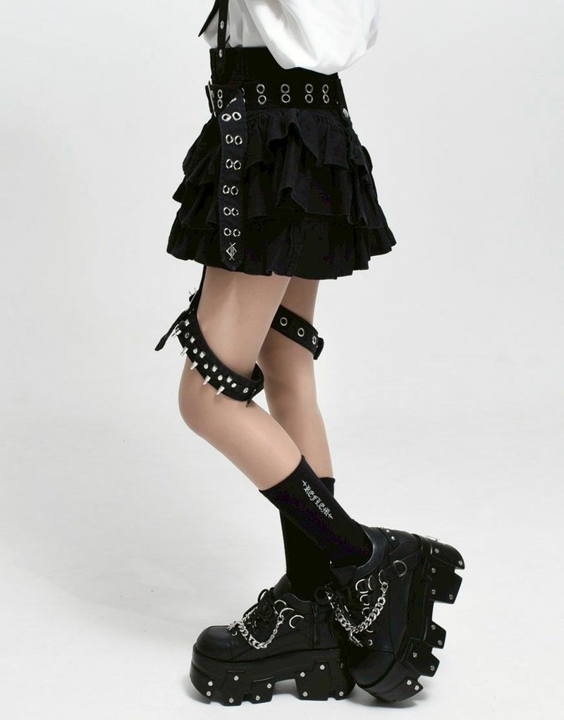 右足のガーターベルトにはハトメとバックル、左足には弾丸モチーフを差し込んだ遊び心ある仕様で、左右非対称のデザインがコーディネートに奥行きを与えます。