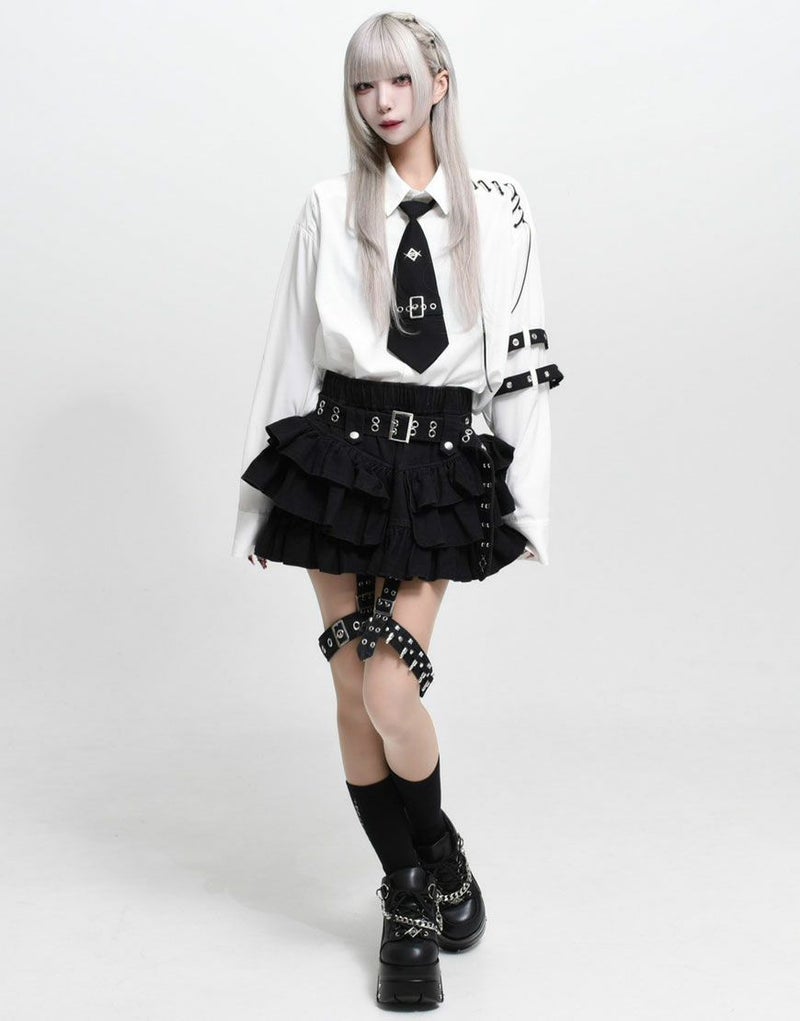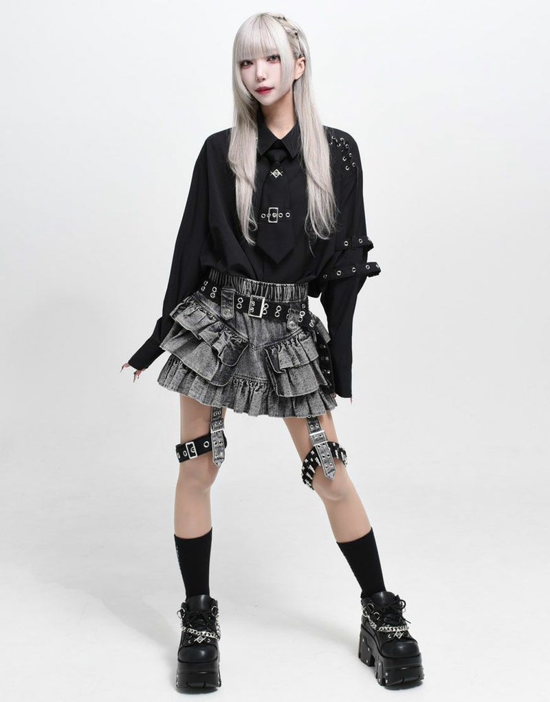 存在感のあるベルトディテールとフリルのボリューム感が、フェティッシュかつモードなバランスを演出します。