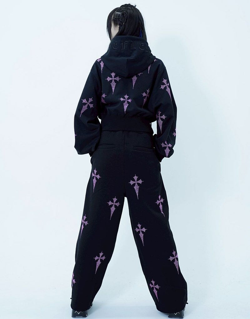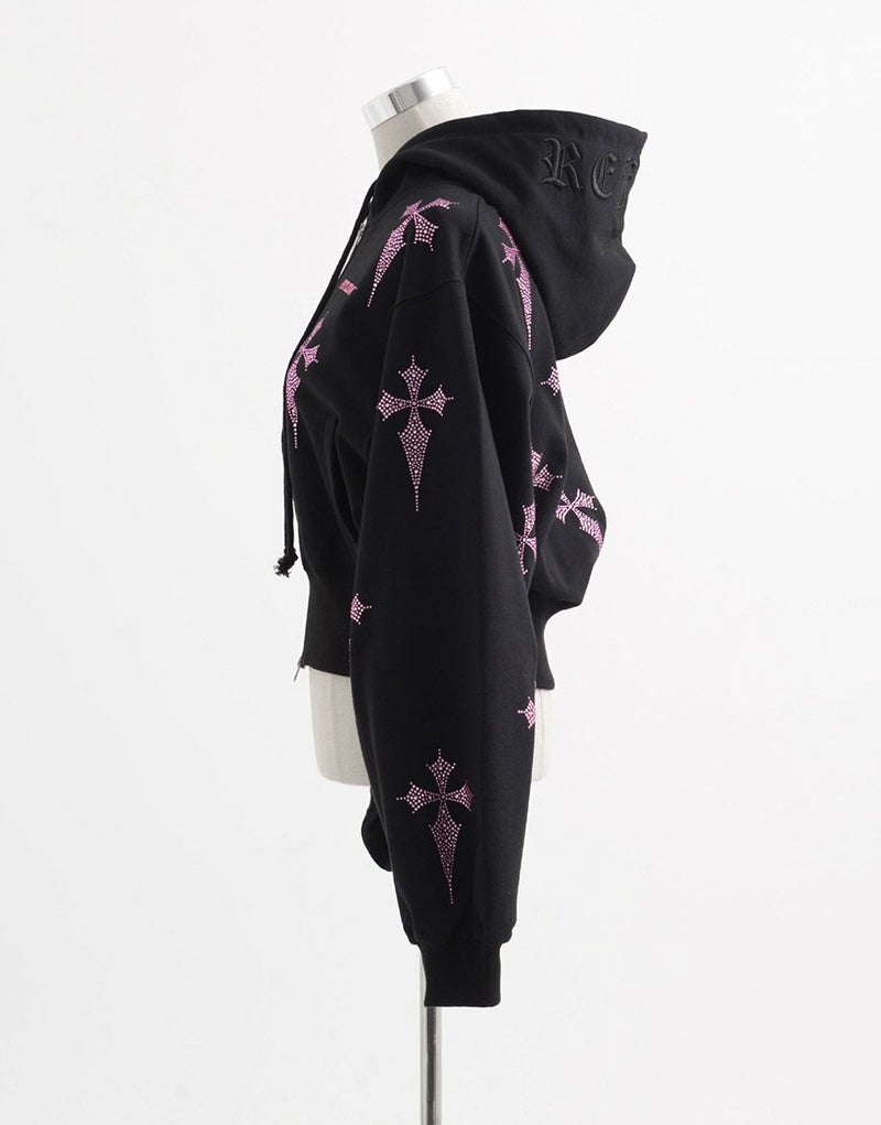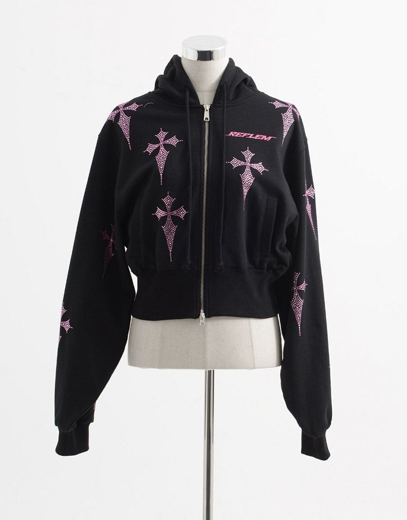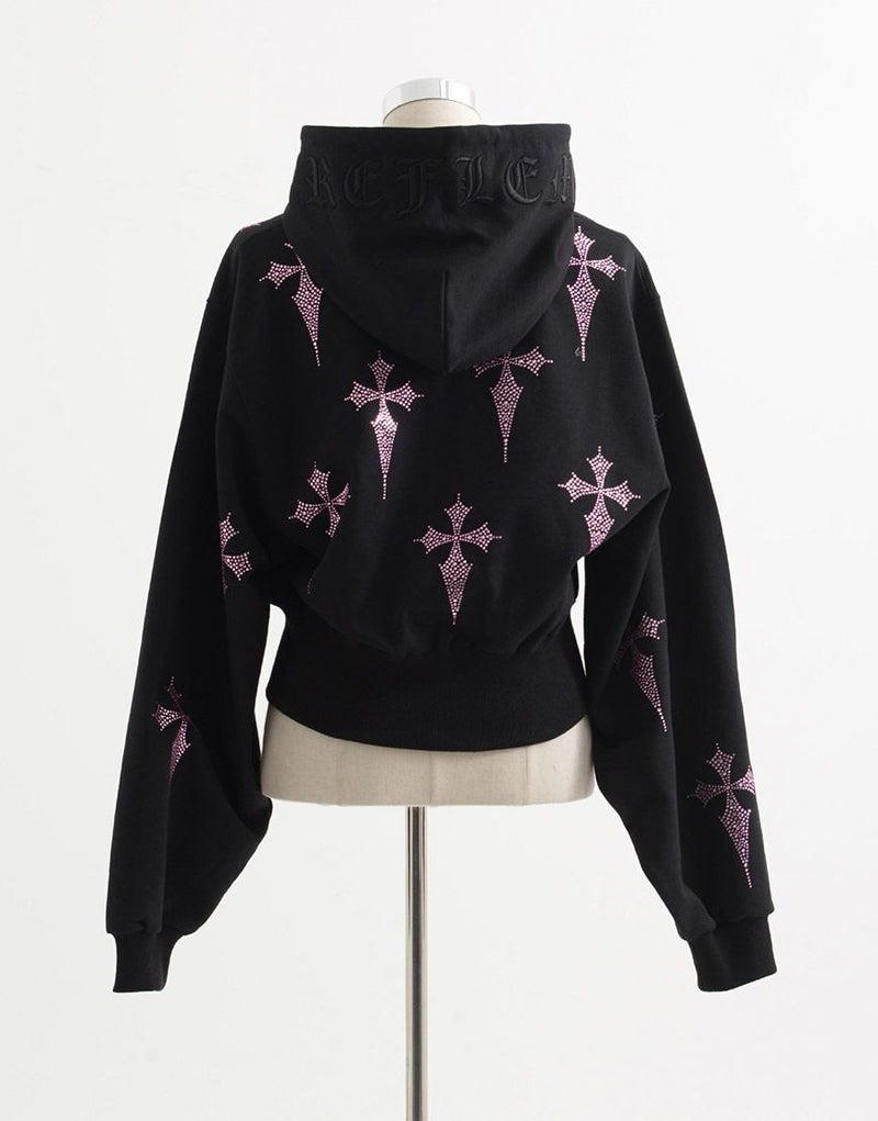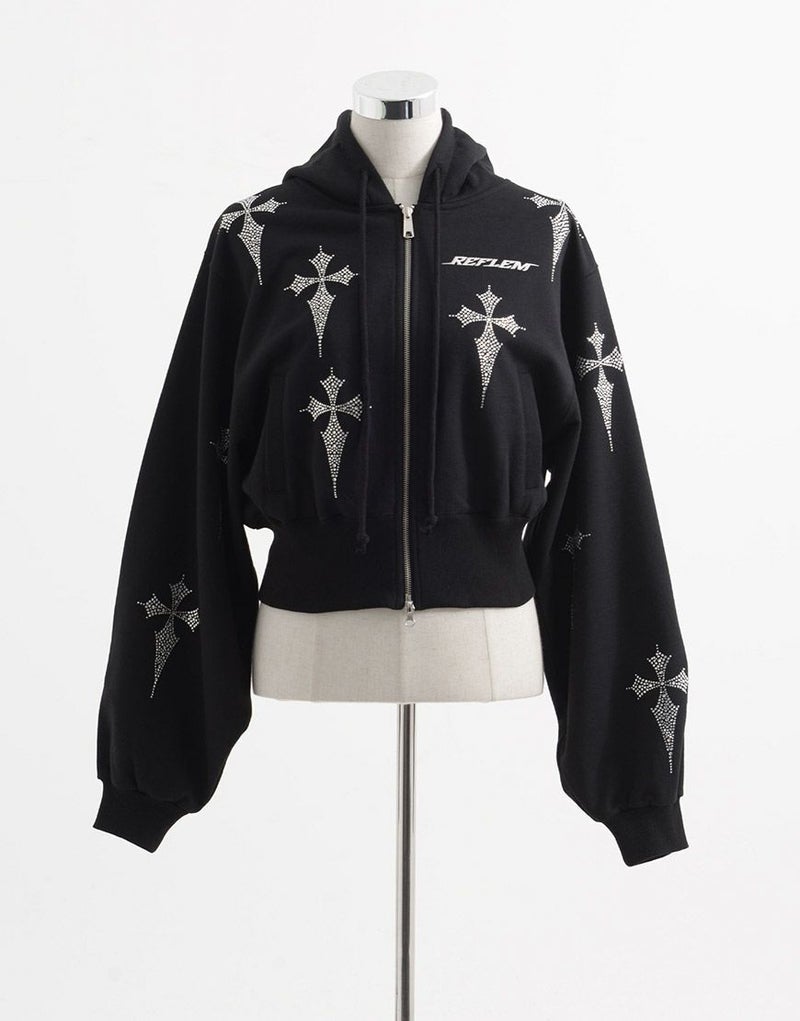 "REFLEM"から ラインストーンクロス総柄長袖クロップドジップアップパーカーが登場。