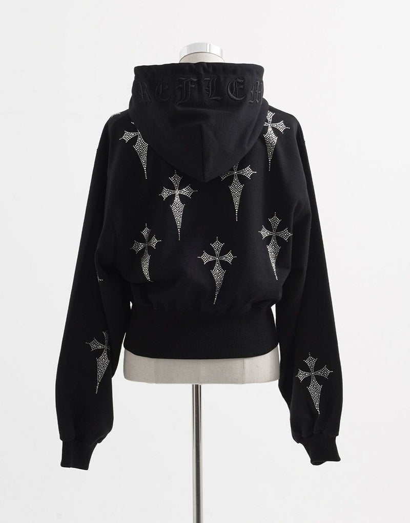 REFLEM【レフレム】ラインストーンクロス総柄長袖クロップドジップアップパーカー/全2色