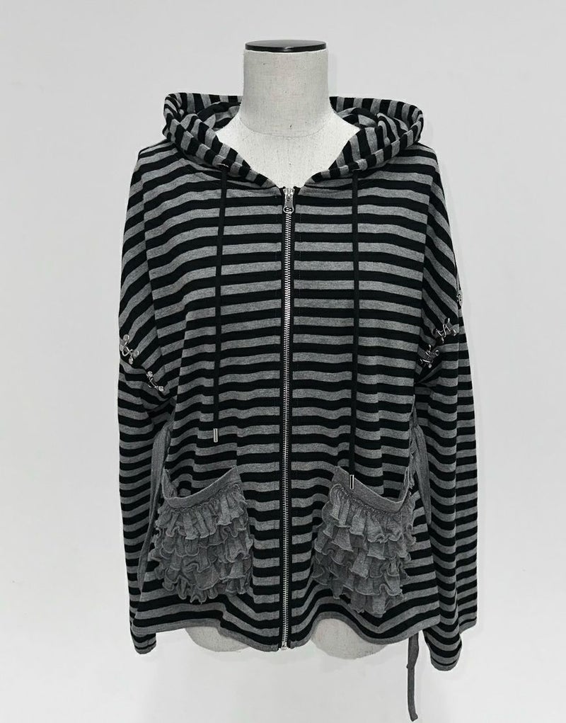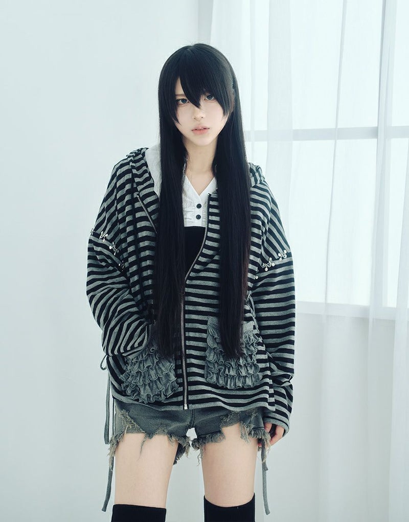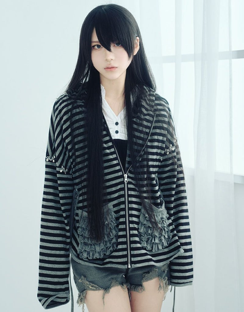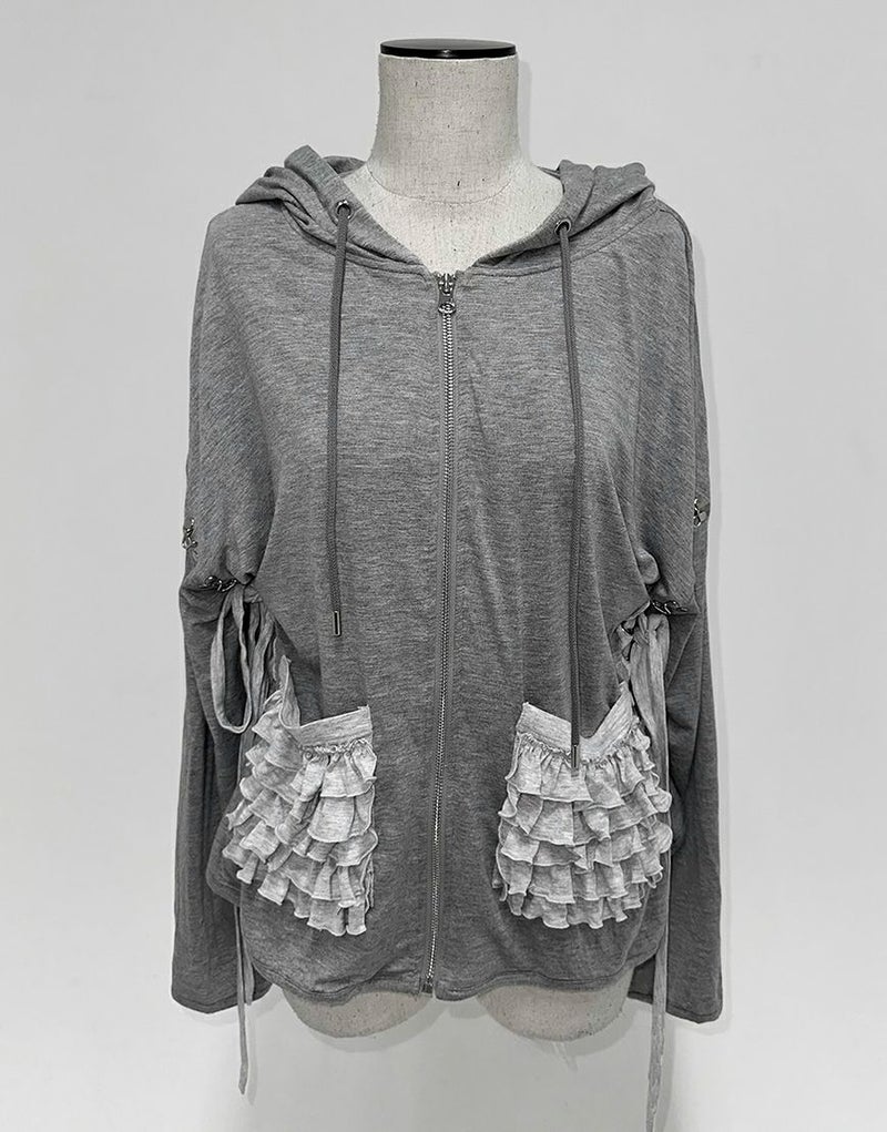 不気味に惹かれるあなたの感性、ダストデビルが叶えてあげる 【DustDevil】 producer/すかる デビルっぽいシックなデザインに天使のようなフリルをミックスしたパーカー 薄い生地と優しい肌触りで、肌寒い日の羽織や日焼け対策としても着られます。 ※お一人様各色2点までの購入の制限とさせていただきます。