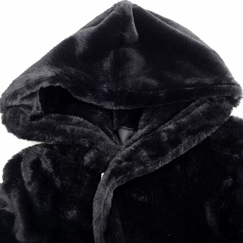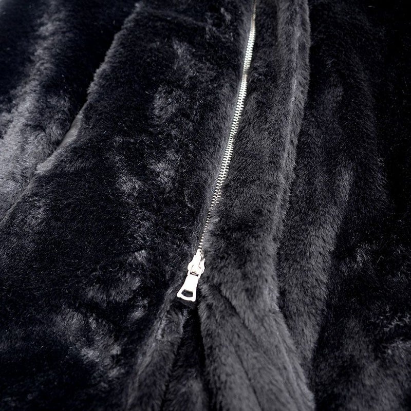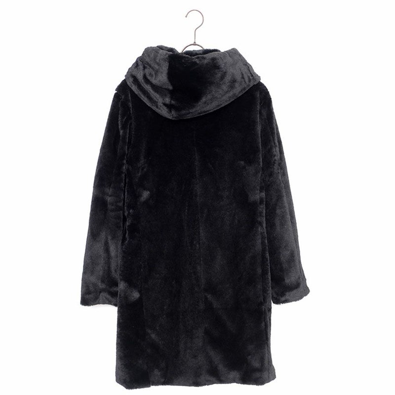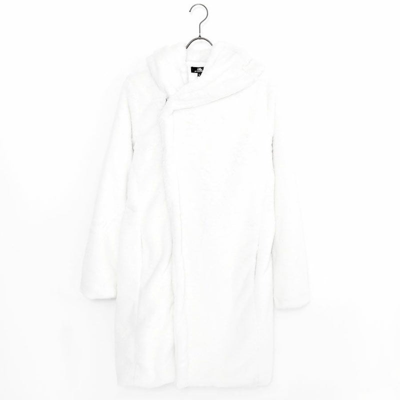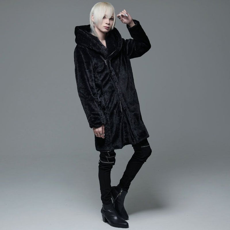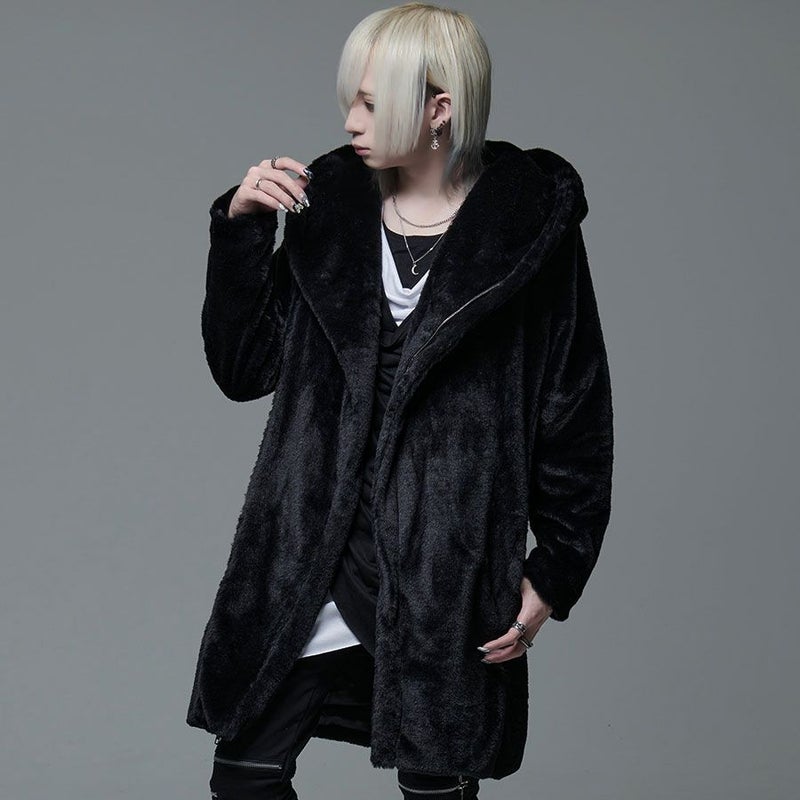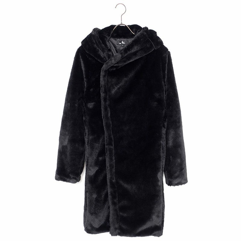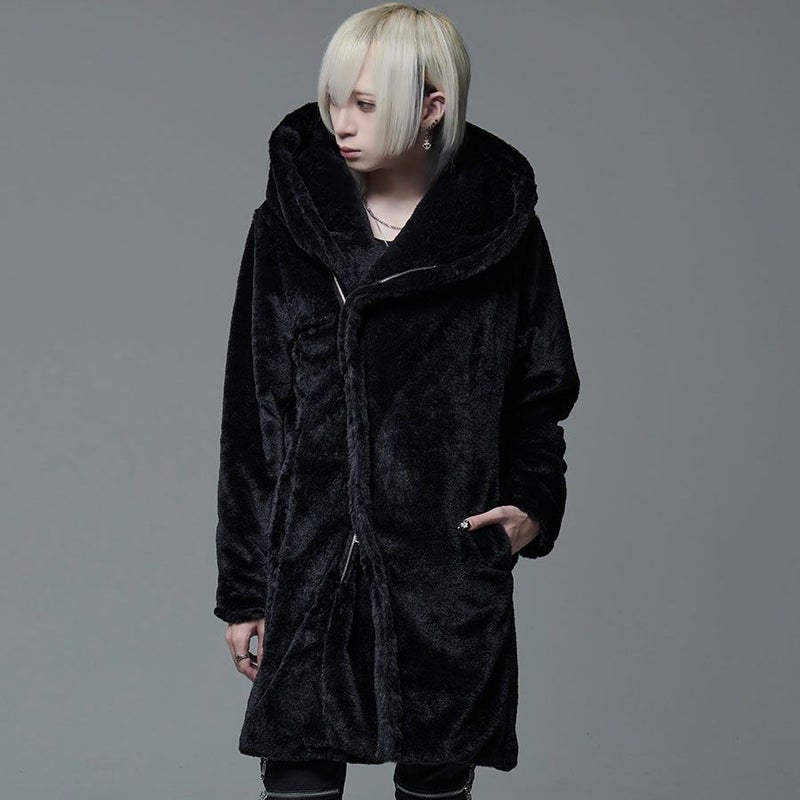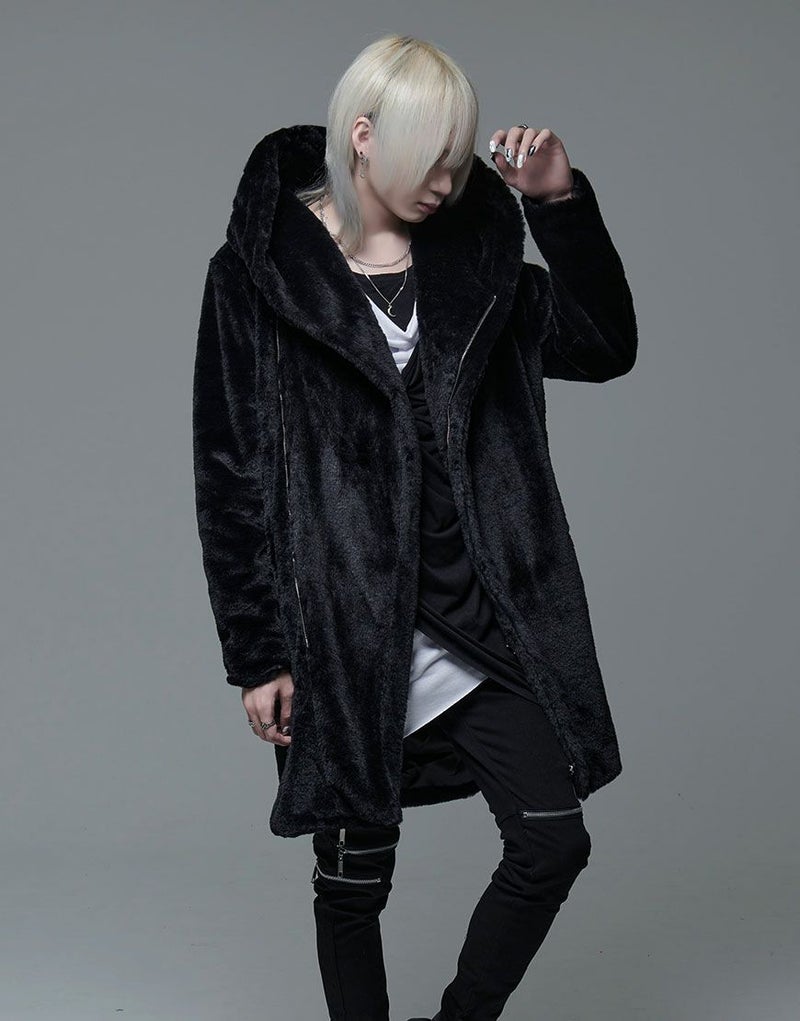 ふわふわモコモコのファー素材を使ったフード付き変形ロングコートです。