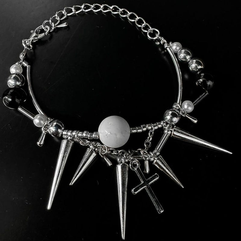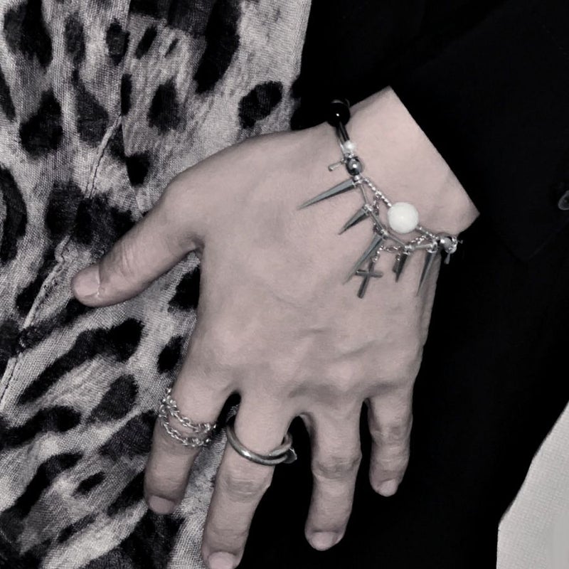 ・シルバー×ブラックを基調に、クロスやスパイクをミックスしたインパクト抜群のデザインのブレスレットと、星ヘアピンがセットになったアイテム。