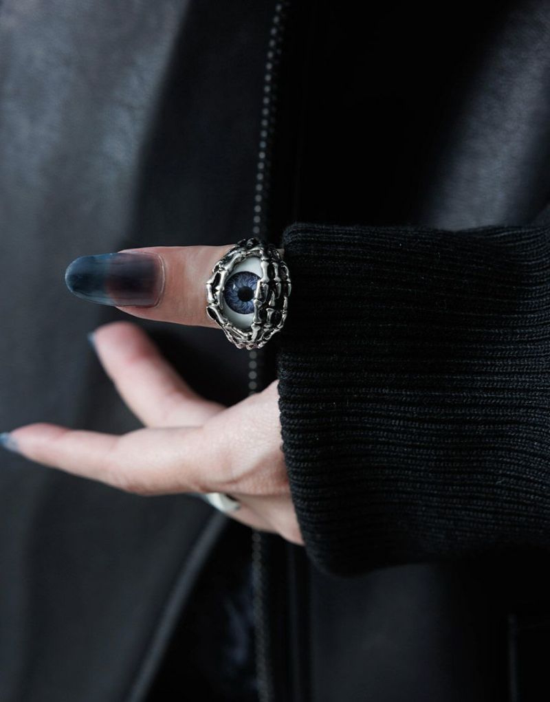リアルな目玉モチーフと、指骨をイメージした立体的なデザインを組み合わせた、ダークでアーティスティックなシルバーリングです。