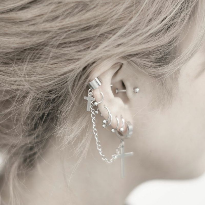 NOVESSELからクロスチェーン付きピアス&イヤーカフが登場しました。 ピアスとイヤーカフをクロスチェーンで連結したお洒落なデザインのアクセサリー。 ロック系のスタイリングは勿論、ピープス系やストリートスタイルのアクセントにもおすすめ◎ ユニセックスとしても着用可能ですので、是非お試しください! ※モデル画像は照明などの影響により実際の商品と異なる場合がございます。