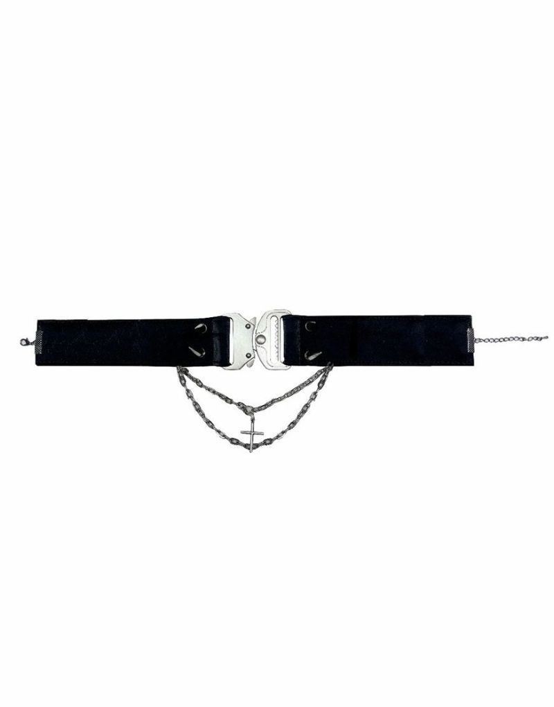 NOVESSEL【ノベセル】からチェーン付バックルベルトチョーカーが登場。 コブラバックルを使用し、チェーン使いにクロスヘッド、スパイクスタッズを配置した絶大な存在感を醸すネックレス。 パンク、ロック系のスタイリングは勿論、地雷コーデや病みかわストリートスタイルのアクセントにもおすすめ◎ ユニセックスとしても着用可能ですので、是非お試しください! ※モデル画像は照明などの影響により実際の商品と異なる場合がございます。