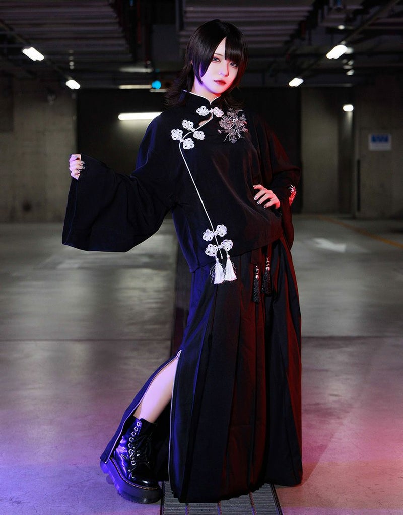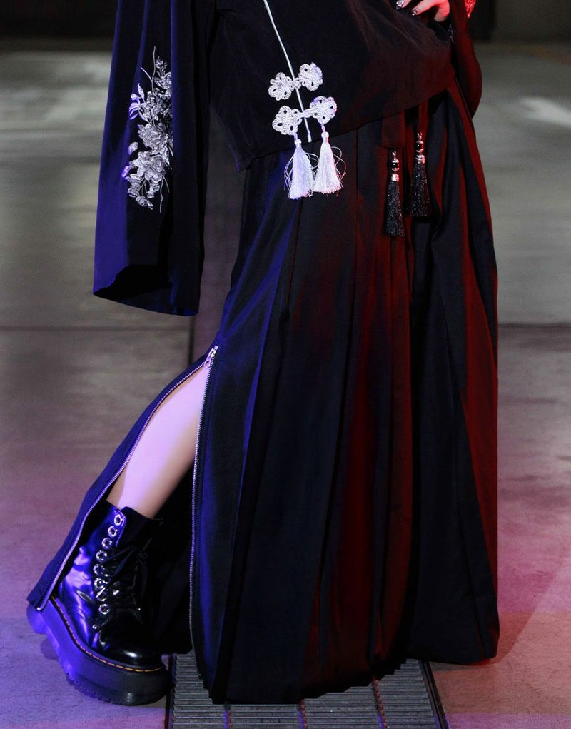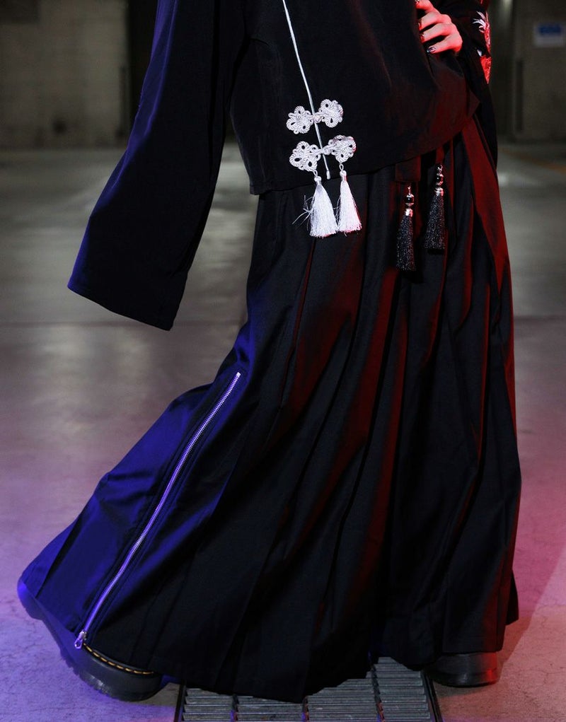 サイドポケット付きで実用性も兼備。和洋折衷のニュアンスを持つ、エッジィなボトムスです。