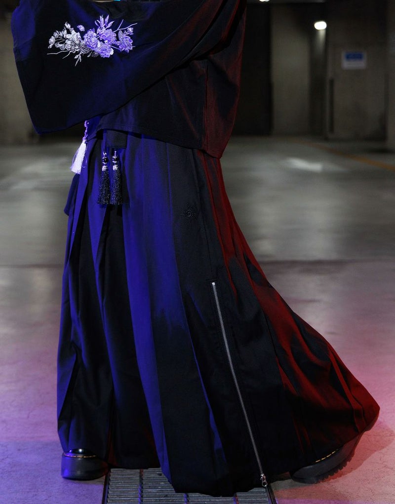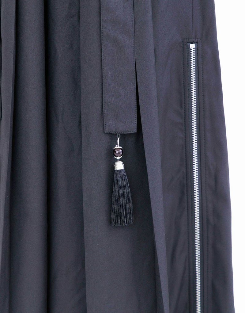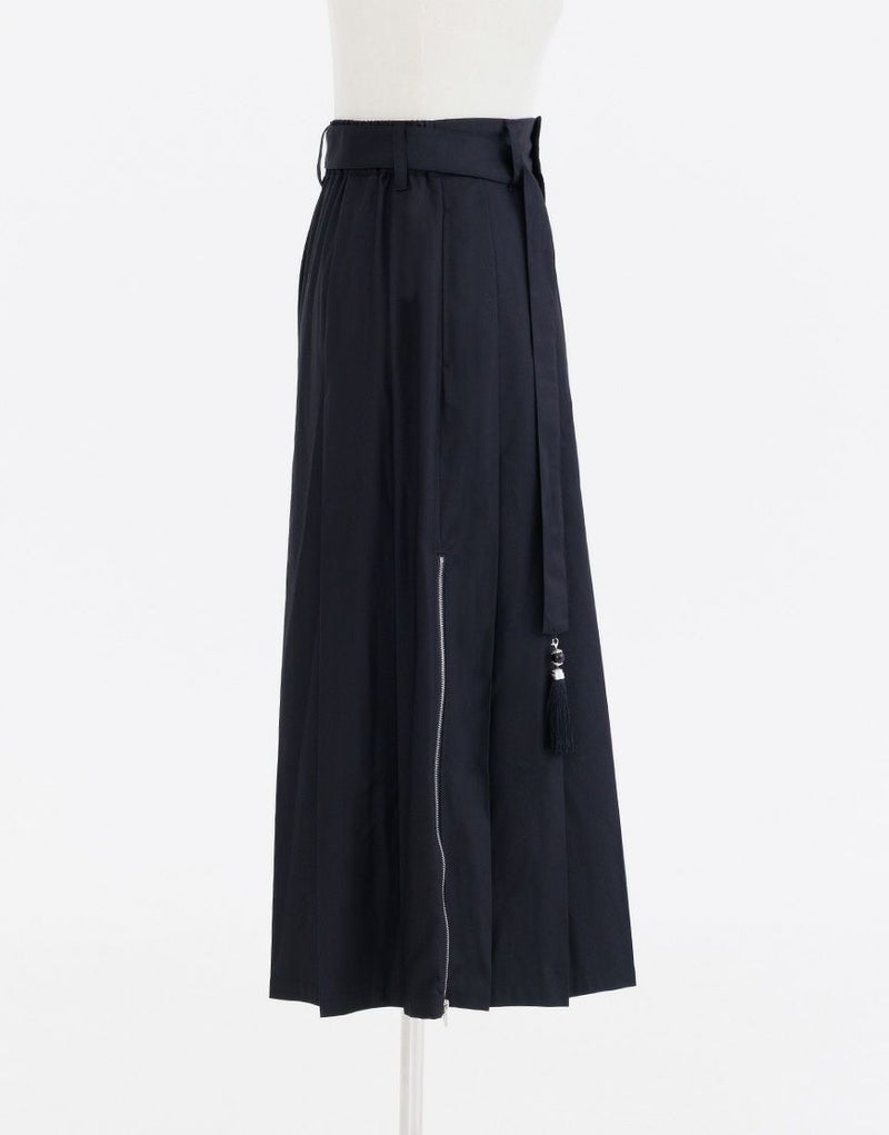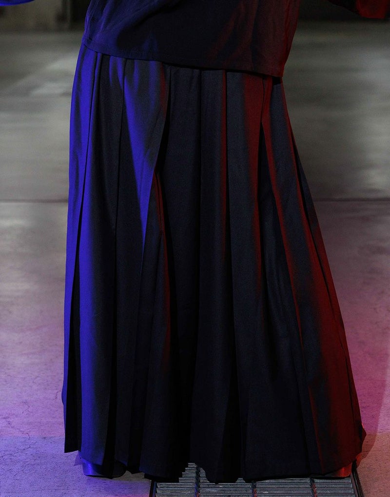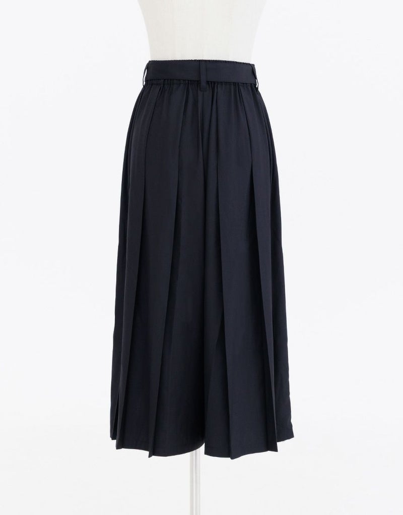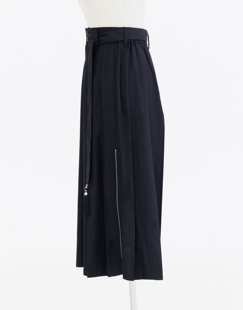 モード感漂う存在感抜群の袴風ワイドパンツ。T/R生地を使用し、落ち感のある上品な仕上がりに。