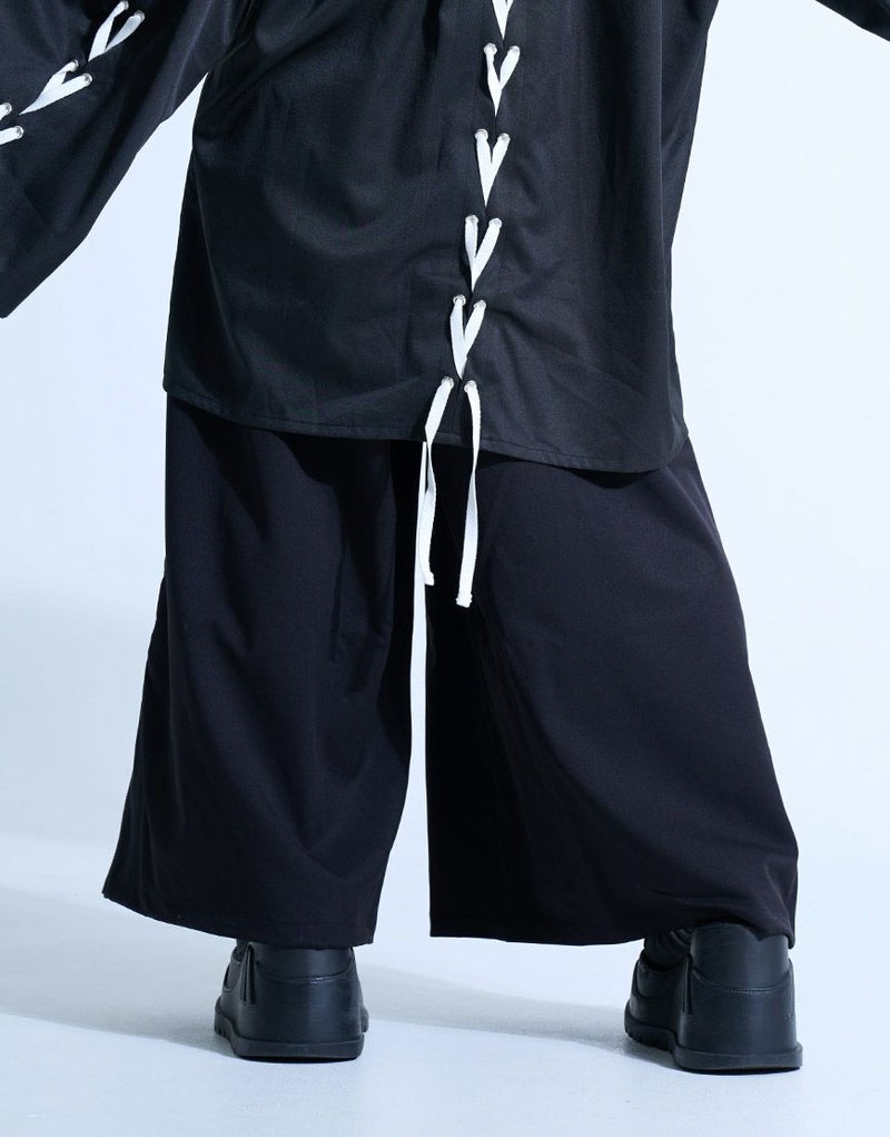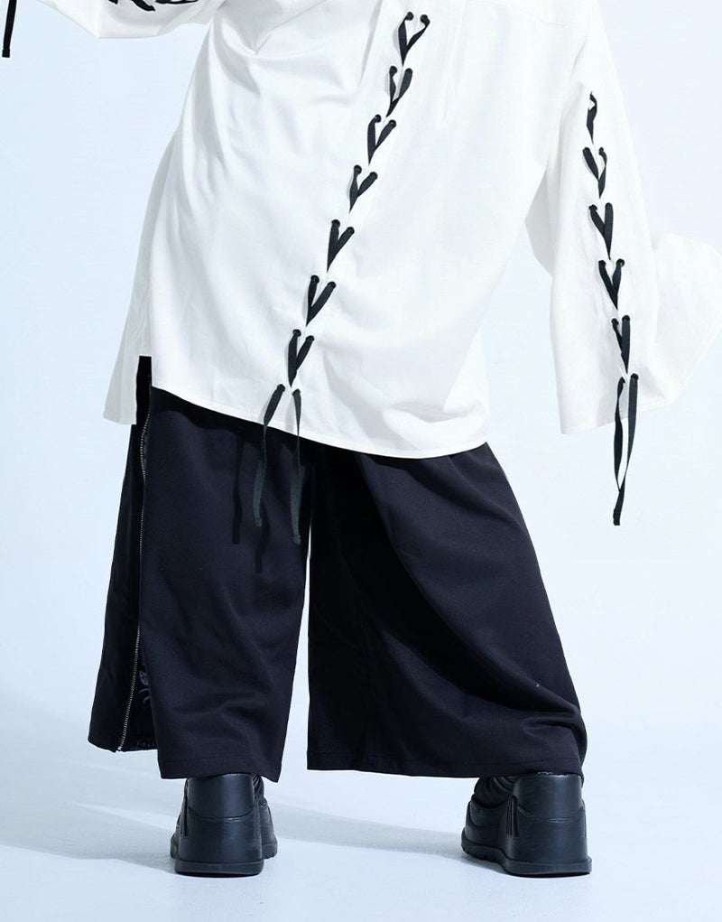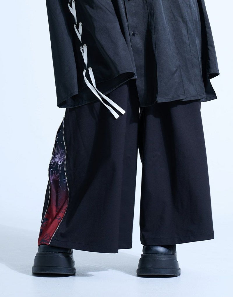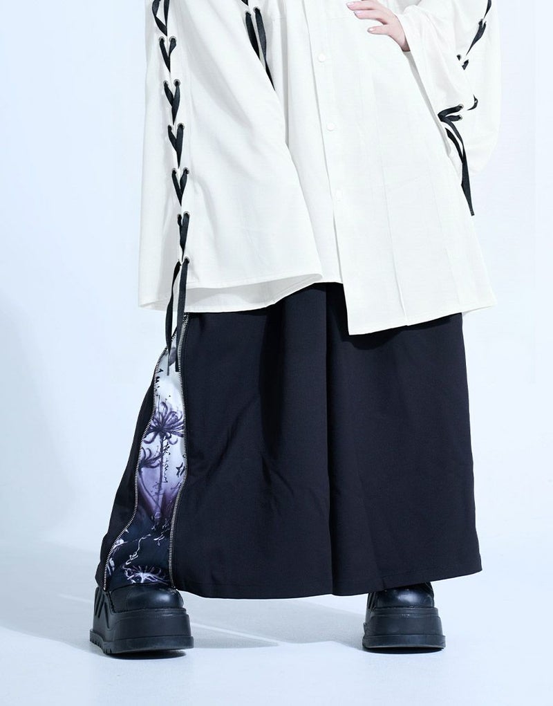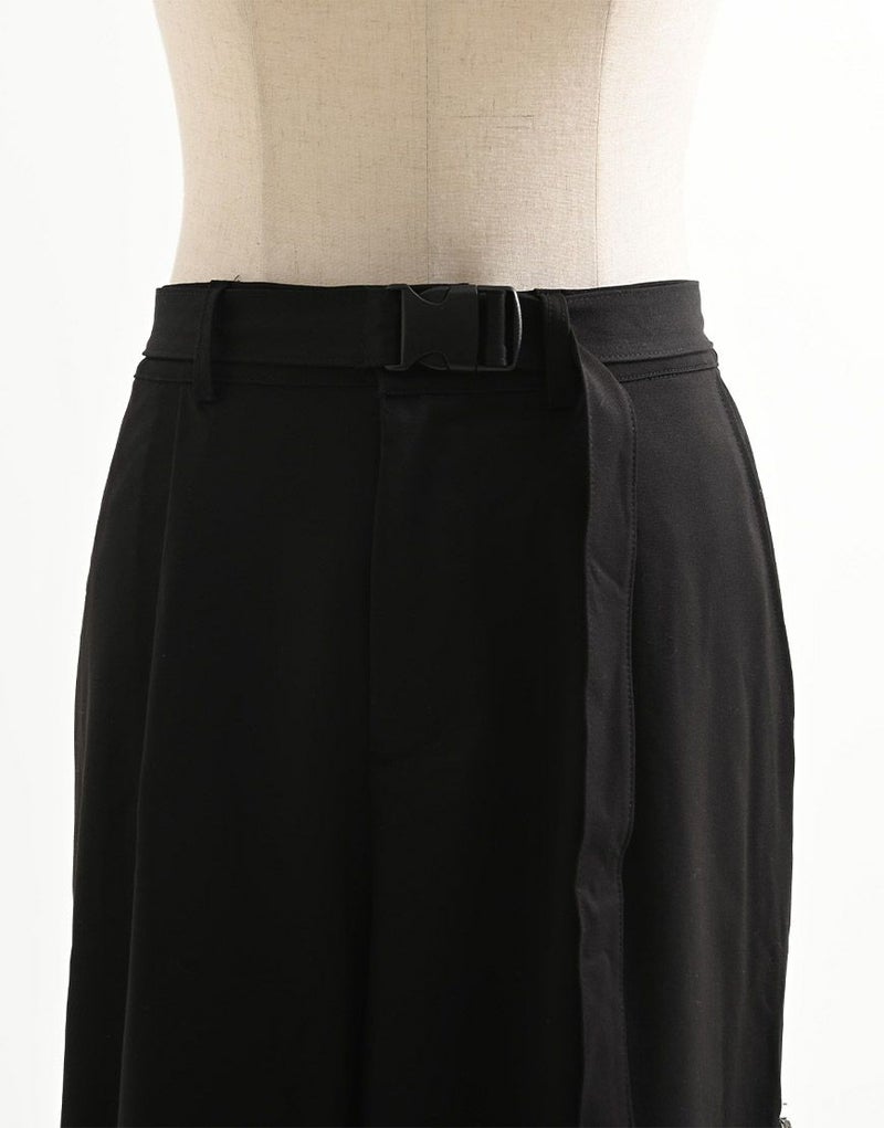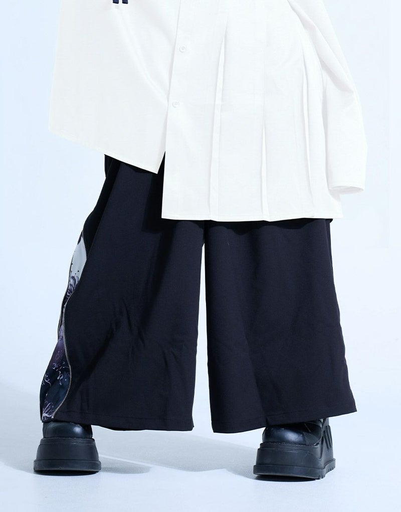 サイドジップの開閉によってシルエットと表情が変わる、2WAY仕様のワイドパンツ。