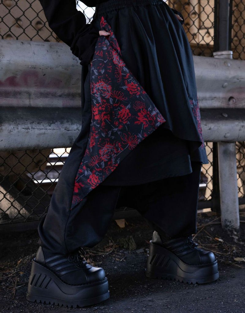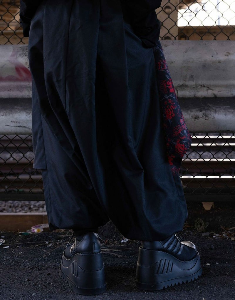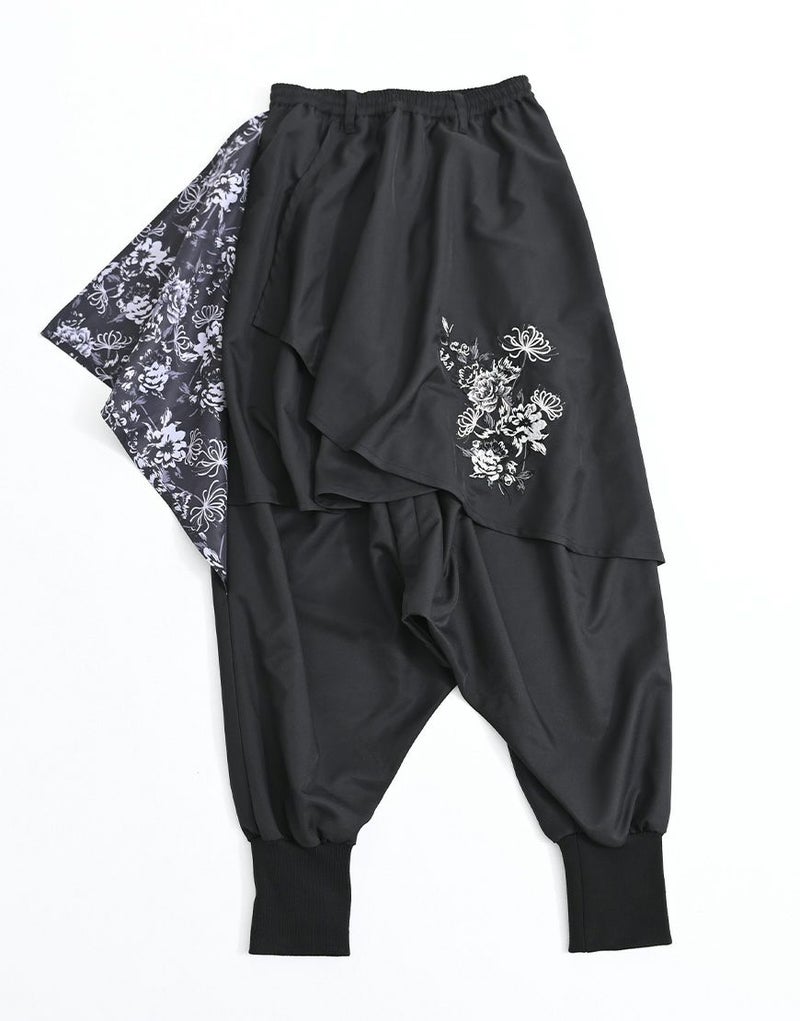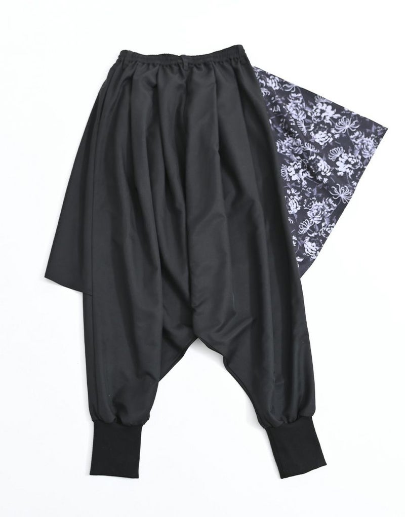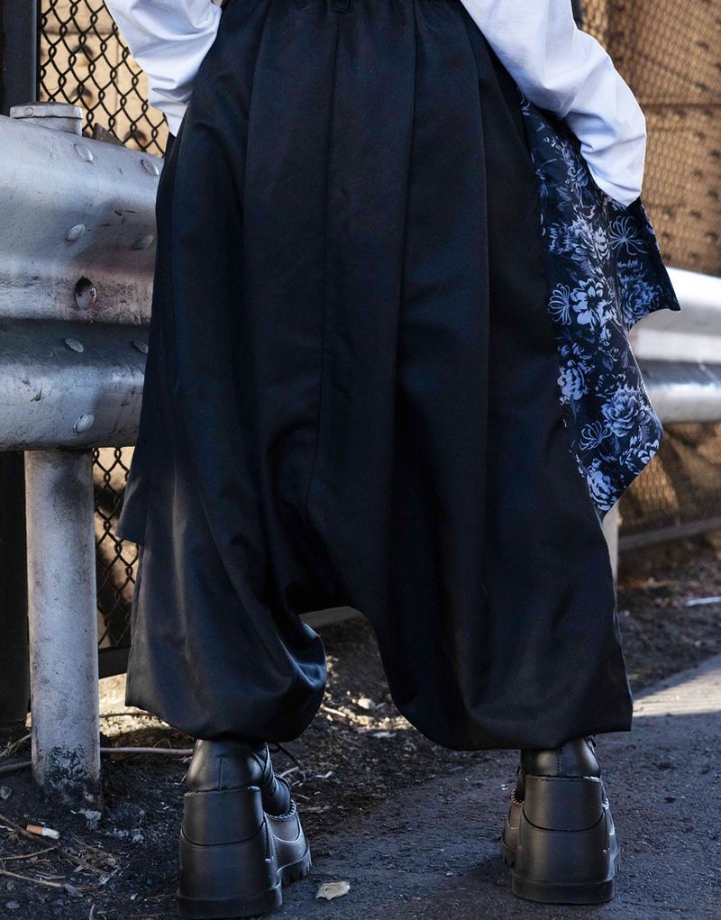 重なり合うドレープが動きに合わせて揺れ、サルエル特有のボリューム感と流れるようなシルエットを際立たせます。
