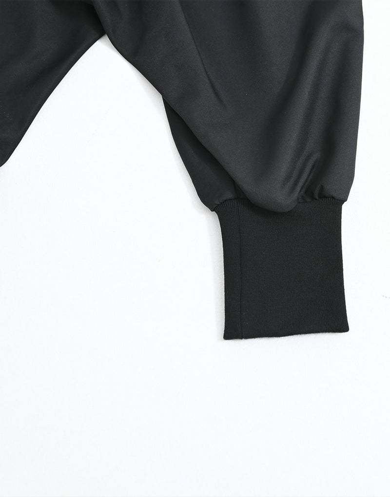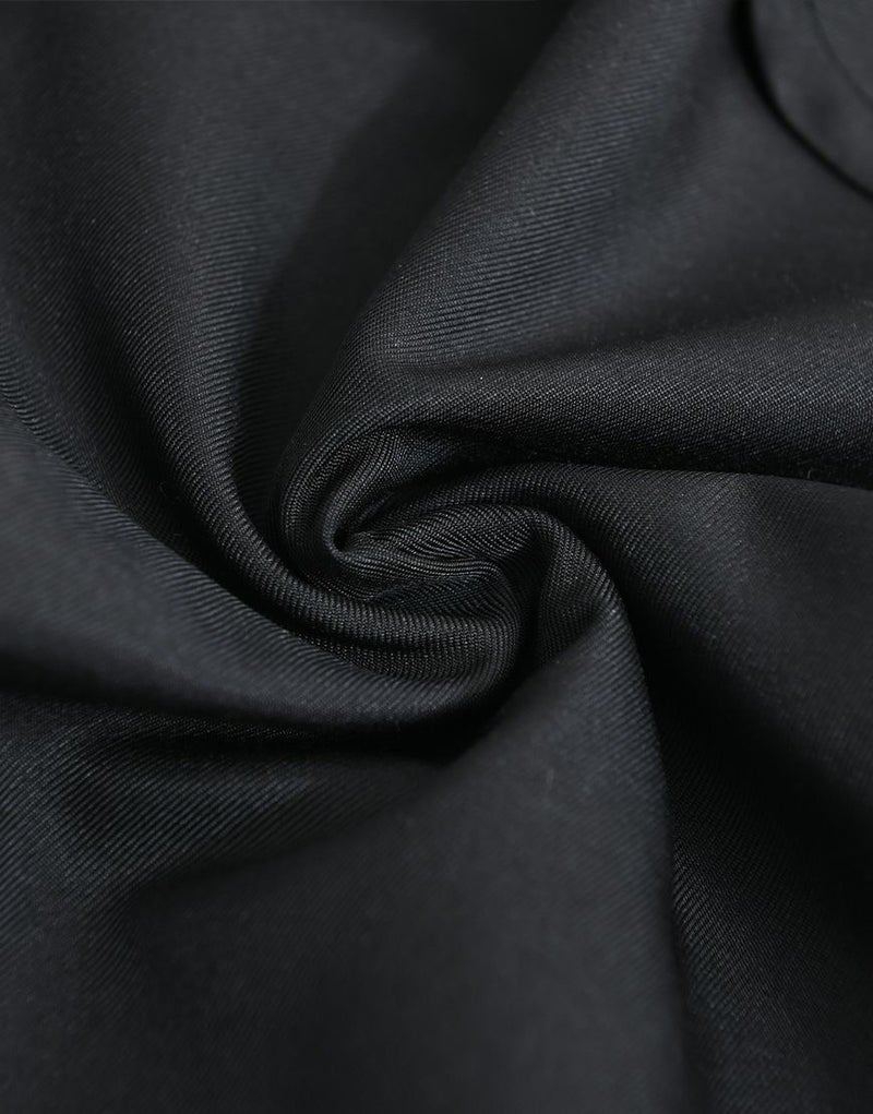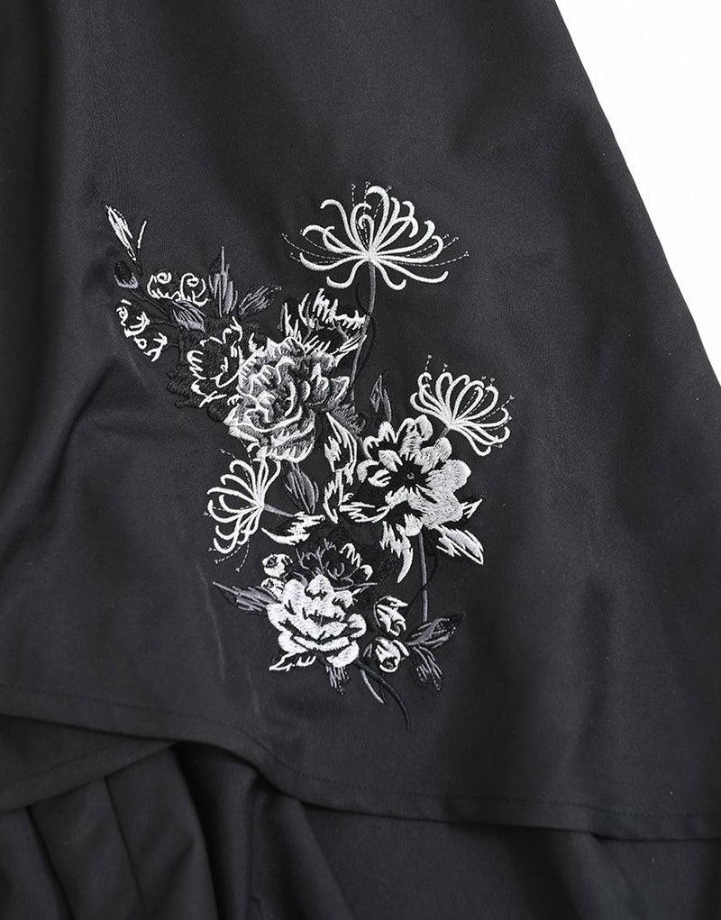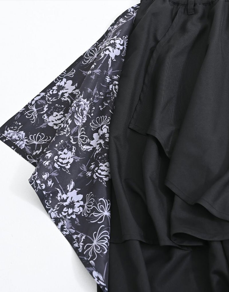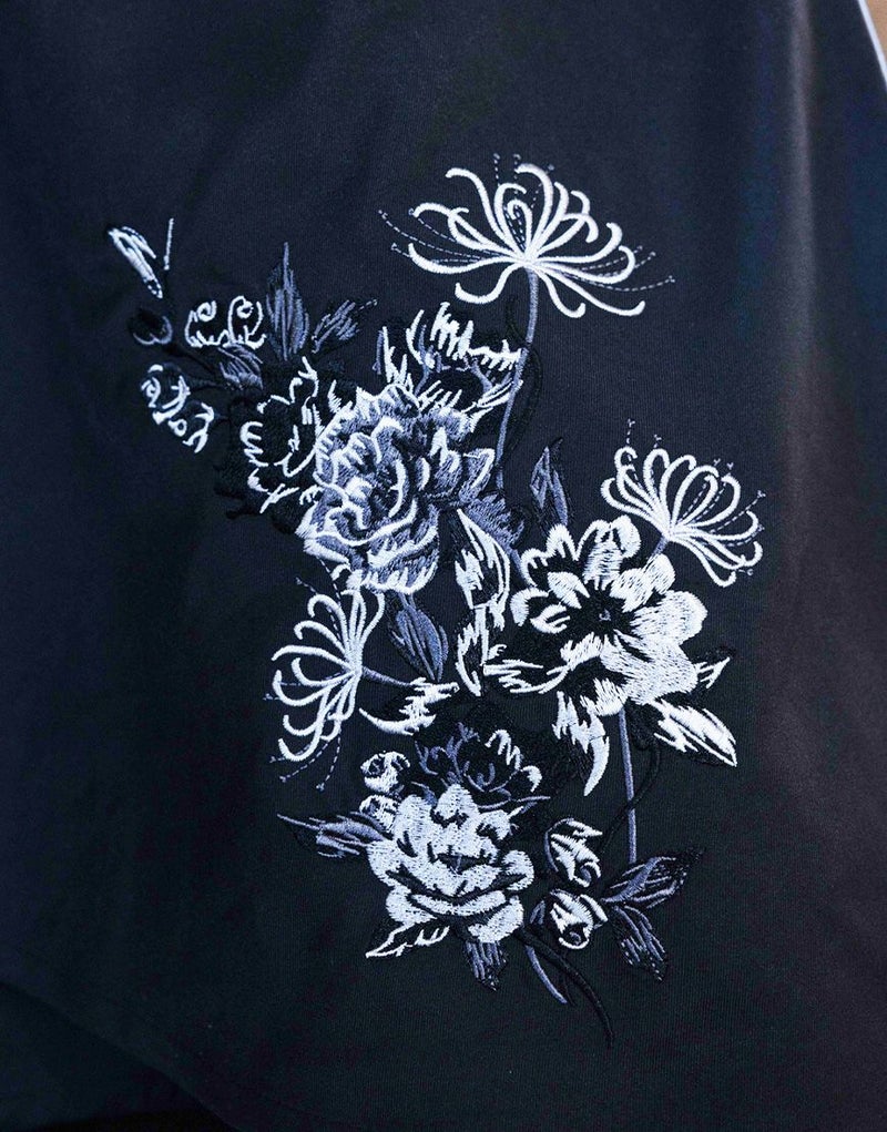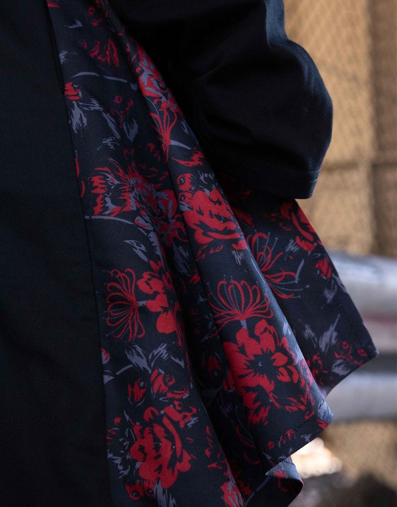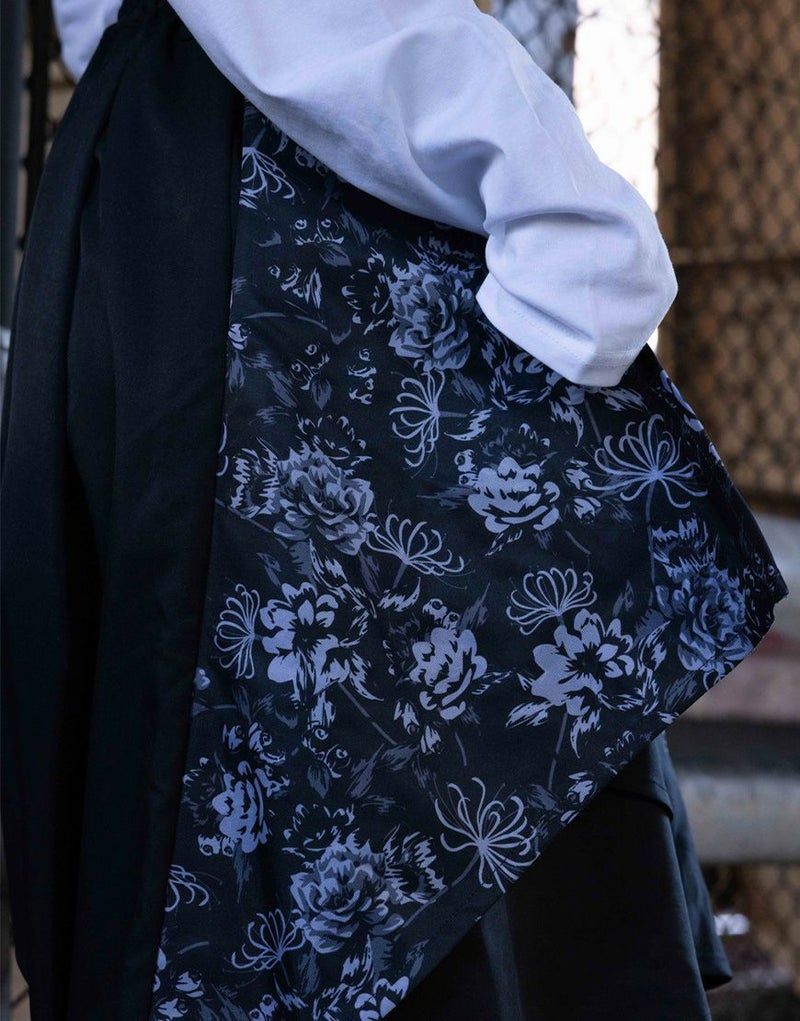 左側には立体感のある刺繍を施し、右側には総柄プリント生地を使用することで、見る角度によって印象が変わるアシンメトリーな表現を演出しています。